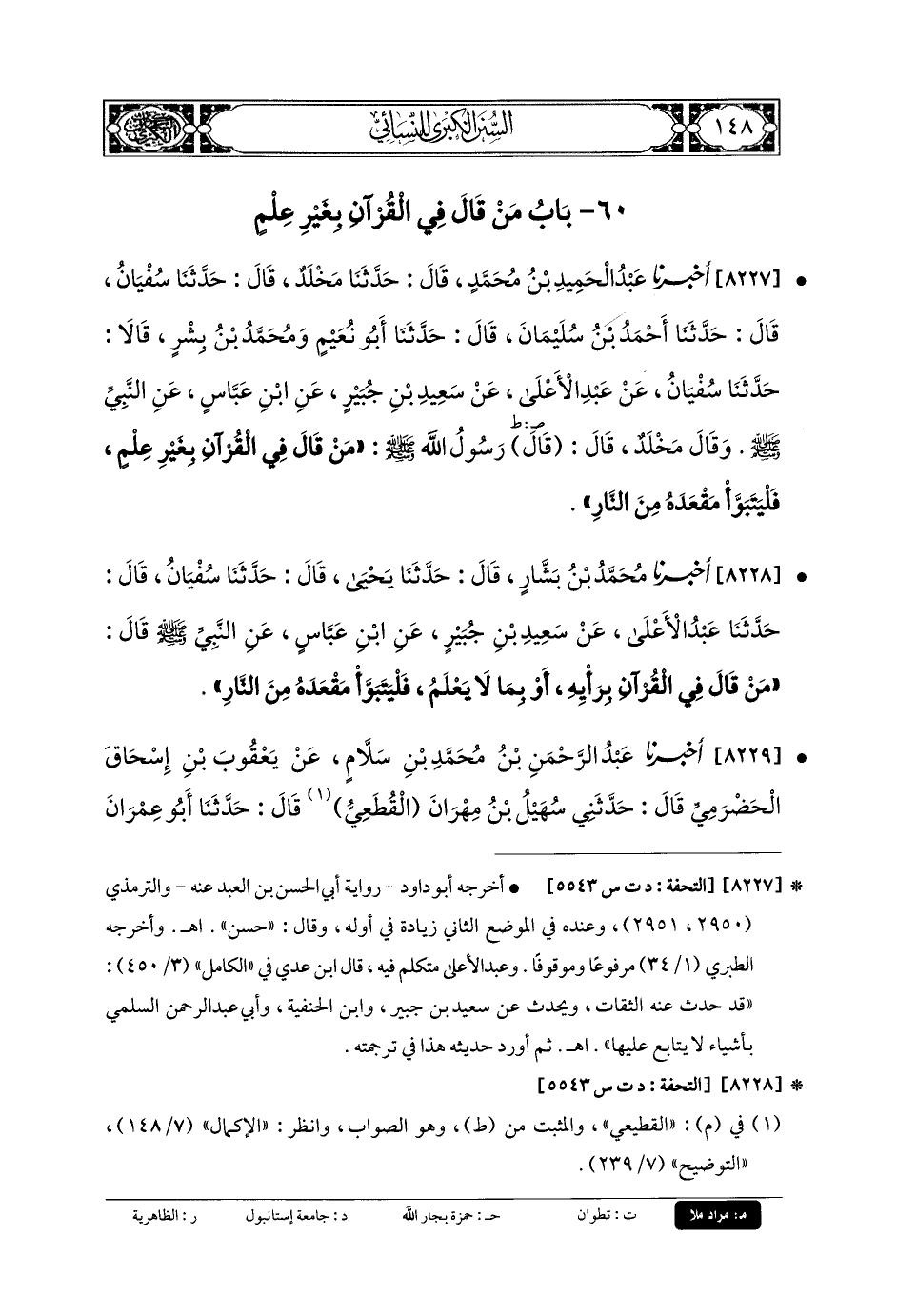 8228- أَخبَرنا مُحَمدُ بنُ بَشَّارٍ، قَالَ: حَدثنا يَحيَى، قَالَ: حَدثنا سُفيانُ، قَالَ: حَدثنا عَبدُ الأَعْلَى، عَن سَعِيدِ بنِ جُبَيْرٍ، عَنِ ابنِ عَبَّاسٍ، عَنِ النَّبيِّ صَلى الله عَلَيهِ وسَلم قَالَ: مَنْ قَالَ فِي القُرْآنِ بِرَأْيِهِ، أَوْ بِمَا لا يَعْلَمُ، فَلْيَتَبَوَّأْ مَقْعَدَهُ مِنَ النَّارِ.