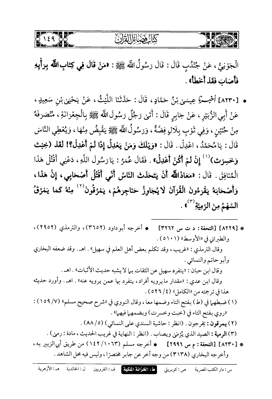 8230- أَخبَرنا عِيسَى بنُ حَمَّادٍ، قَالَ: حَدثنا اللَّيْثُ، عَن يَحيَى بنِ سَعِيدٍ، عَن أَبي الزُّبَيْرِ، عَن جَابِرٍ قَالَ: أَتَى رَجُلٌ رَسُولَ اللهِ صَلى الله عَلَيهِ وسَلم بِالجِعْرَانَةِ مُنْصَرَفَهُ مِنْ حُنَيْنٍ، وَفِي ثَوْبِ بِلالٍ فِضَّةٌ، وَرَسُولُ اللهِ صَلى الله عَلَيهِ وسَلم يَقْبِضُ مِنْهَا وَيُعْطِي النَّاسَ، قَالَ: يَا مُحَمدُ اعْدِلْ، قَالَ: وَيْلَكَ، وَمَنْ يَعْدِلُ إِذَا لَمْ أَعْدِلْ، لَقَدْ خِبْتُ وَخَسِرْتُ إِنْ لَمْ أَكُنْ أَعْدِلُ، فَقَالَ عُمَرُ: يَا رَسُولَ اللهِ، دَعْنِي أَقْتَلُ هَذَا المُنَافِقَ، قَالَ: مَعَاذَ اللهِ أَنْ يَتَحَدَّثَ النَّاسُ أَنِّي أَقْتُلُ أَصْحَابِي، إِنَّ هَذَا وَأَصْحَابَهُ يَقْرَؤونَ القُرْآنَ لا يُجَاوِزُ حَنَاجِرَهُمْ، يَمْرُقُونَ مِنْهُ كَمَا يَمْرُقُ السَّهْمُ مِنَ الرَّمِيَّةِ.