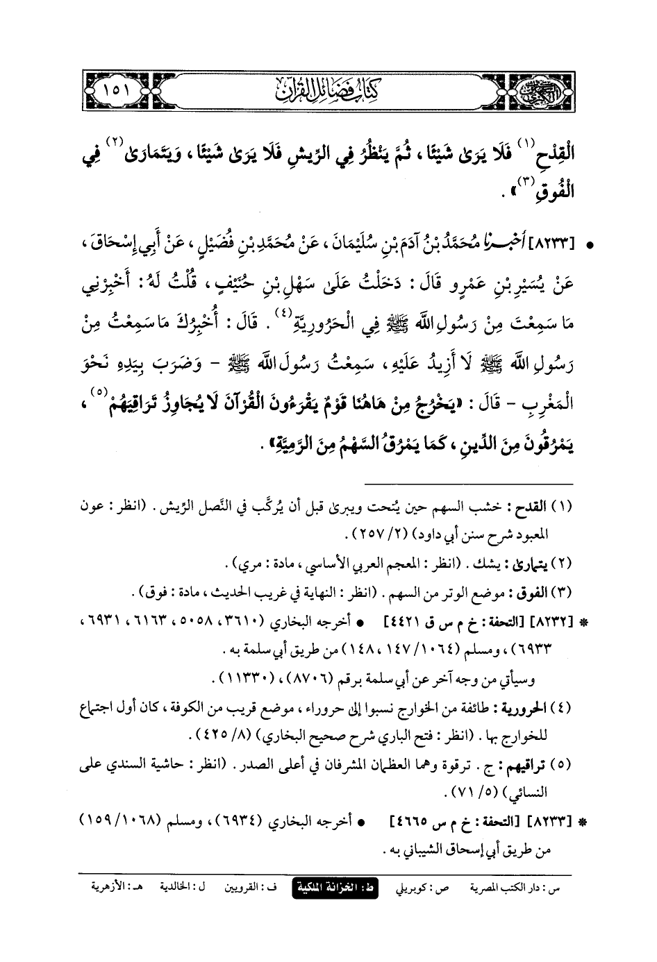 8233- أَخبَرنا مُحَمدُ بنُ آدَمَ بنِ سُلَيمَانَ، عَن مُحَمدِ بنِ فُضَيْلٍ، عَنِ أَبي إِسحَاقَ، عَن يُسَيْرِ بنِ عَمْرٍو قَالَ: دَخَلْتُ عَلَى سَهْلِ بنِ حُنَيْفٍ قُلْتُ لَهُ: أَخْبِرْنِي مَا سَمِعْتَ مِنْ رَسُولِ اللهِ صَلى الله عَلَيهِ وسَلم فِي الحَرُورِيَّةِ، قَالَ: أُخْبِرُكُ مَا سَمِعْتُ مِنْ رَسُولِ اللهِ صَلى الله عَلَيهِ وسَلم لا أَزِيدُ عَلَيْهِ، سَمِعْتُ رَسُولَ اللهِ صَلى الله عَلَيهِ وسَلم وَضَرَبَ بِيَدِهِ نَحْوَ المَغْرِبِ، قَالَ: يَخْرُجُ مِنْ هَاهُنَا قَوْمٌ يَقْرَؤونَ القُرْآنَ لا يُجَاوِزُ تَرَاقِيَهُمْ، يَمْرُقُونَ مِنَ الدِّينِ كَمَا يَمْرُقُ السَّهْمُ مِنَ الرَّمِيَّةِ.