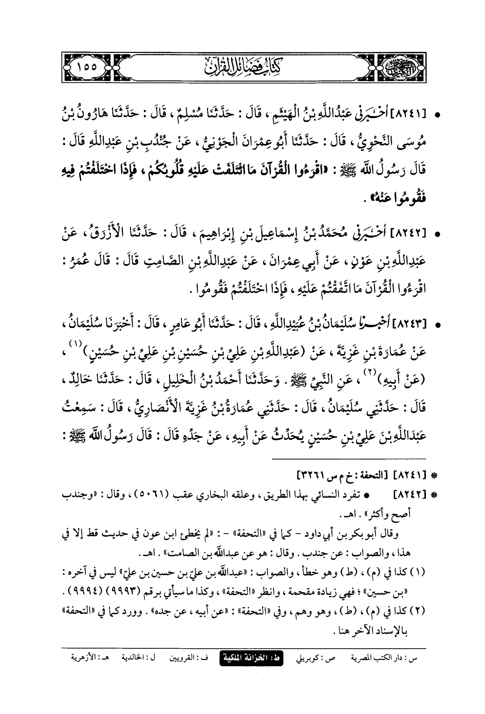 8241- أَخْبَرَنِي عَبدُ اللهِ بنُ الهَيْثَمِ، قَالَ: حَدثنا مُسْلِمٌ، قَالَ: حَدثنا هَارُونُ بنُ مُوسَى النَّحْوِيُّ، قَالَ: حَدثنا أَبو عِمْرَانَ الجَوْنِيُّ، عَن جُنْدُبِ بنِ عَبدِ اللهِ قَالَ: قَالَ رَسُولُ اللهِ صَلى الله عَلَيهِ وسَلم: اقْرَؤُوا القُرْآنَ مَا ائْتَلَفَتْ عَلَيْهِ قُلُوبُكُمْ، فَإِذَا اخْتَلَفْتُمْ فِيهِ فَقُومُوا عَنهُ.