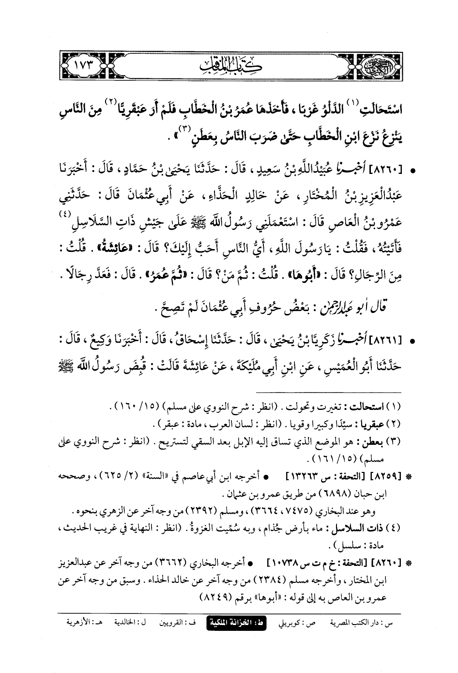 8260 - أَخبَرنا عُبَيدُ اللهِ بنُ سَعِيدٍ، قَالَ: حَدثنا يَحيَى بنُ حَمَّادٍ، قَالَ: أَخبَرنا عَبدُ العَزِيزِ بنُ المُخْتَارِ، عَن خَالِدٍ الحَذَّاءِ، عَن أَبي عُثْمَانَ، قَالَ: حَدَّثني عَمْرُو بنُ العَاصِ قَالَ: اسْتَعْمَلَنِي رَسُولُ اللهِ صَلى الله عَلَيهِ وسَلم عَلَى جَيْشِ ذَاتِ السَّلاسِلِ، فَأَتَيْتُهُ، فَقُلْتُ: يَا رَسُولَ اللهِ، أَيُّ النَّاسِ أَحَبُّ إِلَيْكَ؟ قَالَ: عَائِشَةُ، قُلْتُ: مِنَ الرِّجَالِ؟ قَالَ: أَبوهَا، قُلْتُ: ثُمَّ مَنْ؟ قَالَ: ثم عُمَرُ، فَعَدَّ رِجَالاً، قَالَ أَبو عَبدِ الرَّحمَنِ: بَعْضُ حُرُوفِ أَبي عُثْمَانَ لَمْ تَصِحَّ.
