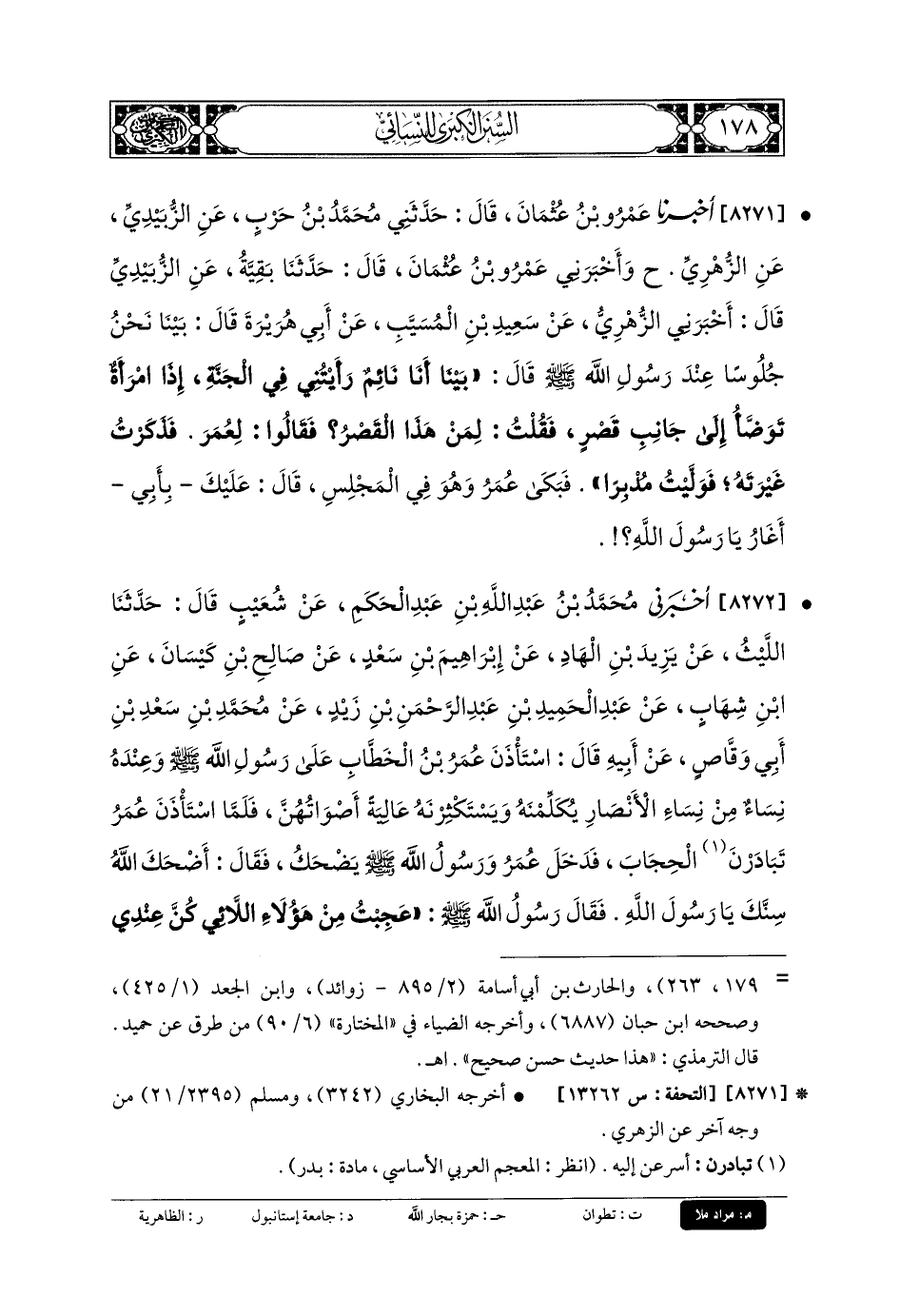 8271 - أَخبَرنا عَمْرُو بنُ عُثْمَانَ، قَالَ: حَدَّثني مُحَمدُ بنُ حَرْبٍ، عَنِ الزُّبَيْدِيِّ، عَنِ الزُّهْرِيِّ، (ح) وَأَخْبَرَنِي عَمْرُو بنُ عُثْمَانَ، قَالَ: حَدثنا بَقِيَّةُ، عَنِ الزُّبَيْدِيِّ، قَالَ: أَخْبَرَنِي الزُّهْرِيُّ، عَن سَعِيدِ بنِ المُسَيَّبِ، عَن أَبي هُرَيْرَةَ قَالَ: بَيْنَا نَحْنُ جُلُوسا عِنْدَ رَسُولِ اللهِ صَلى الله عَلَيهِ وسَلم قَالَ: بَيْنَا أَنَا نَائِمٌ رَأَيْتُنِي فِي الجَنَّةِ، إِذَا امْرَأَةٌ تَوَضَّأُ إِلَى جَانِبِ قَصْرٍ، فَقُلْتُ: لِمَنْ هَذَا القَصْرُ؟ فَقَالُوا: لِعُمَرَ، فَذَكَرْتُ غَيْرَتَهُ، فَوَلَّيْتُ مُدْبِرًا، فَبَكَى عُمَرُ وَهُوَ فِي المَجْلِسِ، قَالَ: عَلَيْكَ بِأَبي أَغَارُ يَا رَسُولَ اللهِ.