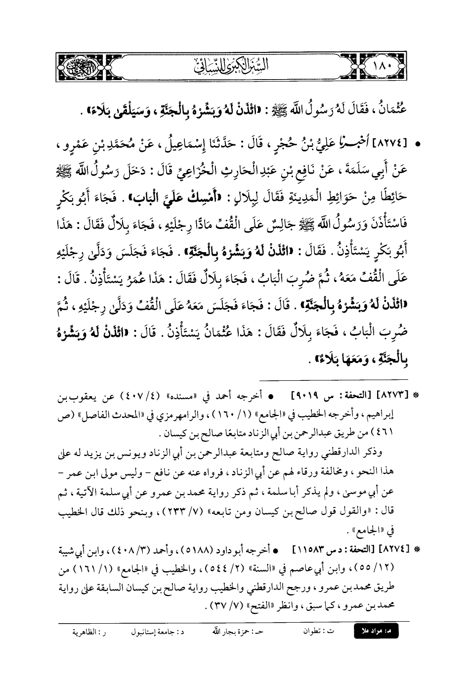8274 - أَخبَرنا عَليُّ بنُ حُجْرٍ، قَالَ: حَدثنا إِسمَاعِيلُ، عَن مُحَمدِ بنِ عَمْرٍو، عَن أَبي سَلَمَةَ، عَن نَافِعِ بنِ عَبدِ الحَارِثِ الخُزَاعِيِّ قَالَ: دَخَلَ رَسُولُ اللهِ صَلى الله عَلَيهِ وسَلم حَائِطًا مِنْ حَوَائِطِ المَدِينَةِ، فَقَالَ لِبِلالٍ: أَمْسِكْ عَلَيَّ البَابَ، فَجَاءَ أَبو بَكْرٍ فَاسْتَأْذَنَ، وَرَسُولُ اللهِ صَلى الله عَلَيهِ وسَلم جَالِسٌ عَلَى القُفِّ مَادًّا رِجْلَيْهِ، فَجَاءَ بِلالٌ فَقَالَ: هَذَا أَبو بَكْرٍ يَسْتَأْذِنُ، فَقَالَ: ائْذَنْ لَهُ وَبَشِّرْهُ بِالجَنَّةِ، فَجَاءَ فَجَلَسَ وَدَلَّى رِجْلَيْهِ عَلَى القُفِّ مَعَهُ، ثُمَّ ضُرِبَ البَابُ، فَجَاءَ بِلالٌ فَقَالَ: هَذَا عُمَرُ يَسْتَأْذِنُ، قَالَ: ائْذَنْ لَهُ وَبَشِّرْهُ بِالجَنَّةِ، قَالَ: فَجَاءَ فَجَلَسَ مَعَهُ عَلَى القُفِّ، وَدَلَّى رِجْلَيْهِ، ثُمَّ ضُرِبَ البَابُ، فَجَاءَ بِلالٌ فَقَالَ: هَذَا عُثْمَانُ يَسْتَأْذِنُ، قَالَ: ائْذَنْ لَهُ وَبَشِّرْهُ بِالجَنَّةِ، وَمَعَهَا بَلاءٌ.