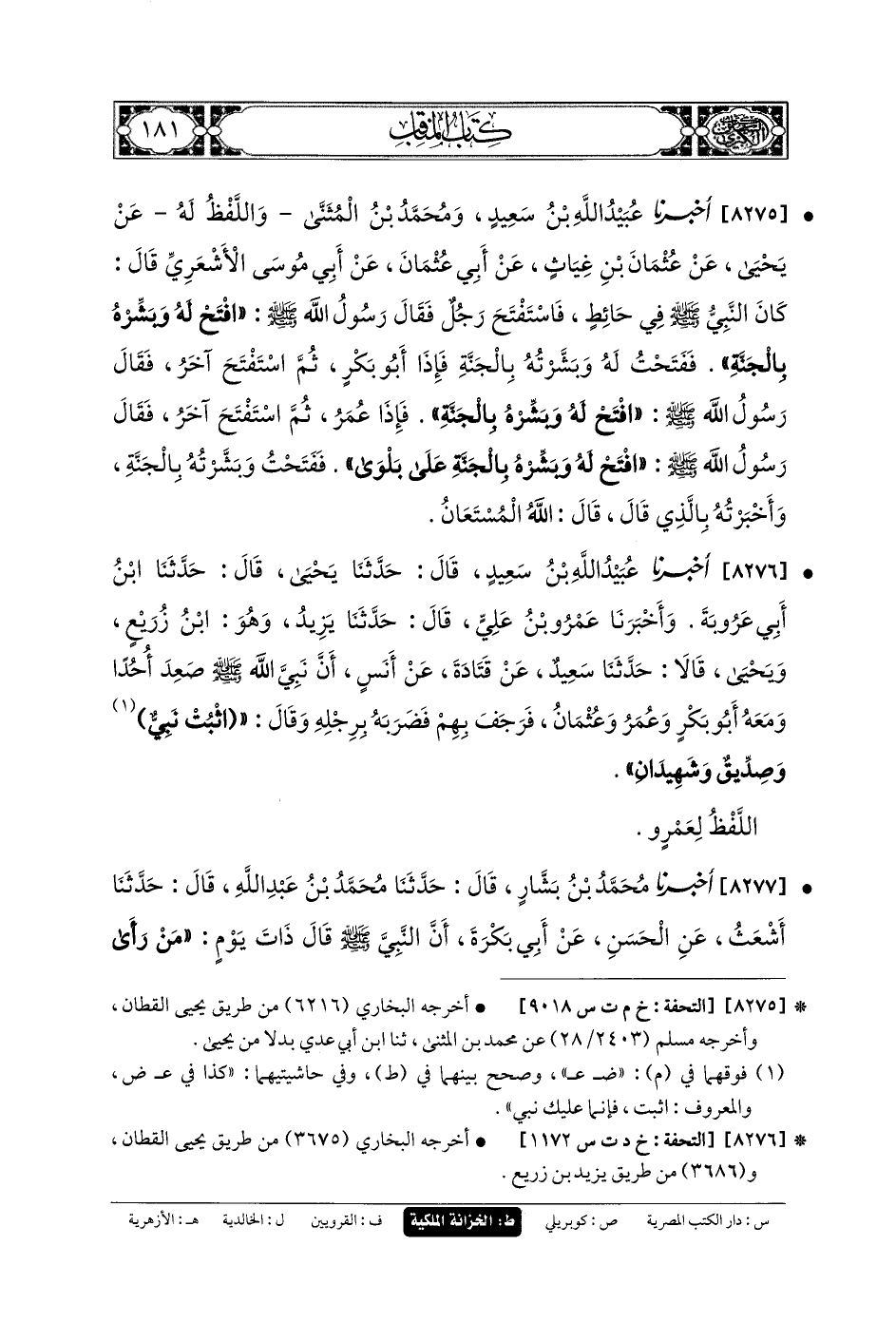8276 - أَخبَرنا عُبَيدُ اللهِ بنُ سَعِيدٍ، قَالَ: حَدثنا يَحيَى، قَالَ: حَدثنا ابنُ أَبي عَرُوبَةَ، وَأَخبَرنا عَمْرُو بنُ عَليٍّ، قَالَ: حَدثنا يَزِيدُ، وَهُوَ ابنُ زُرَيْعٍ، وَيَحيَى، قَالا: حَدثنا سَعِيدٌ، عَن قَتَادَةَ، عَن أَنَسٍ، أَنَّ نَبِيَّ اللهِ صَلى الله عَلَيهِ وسَلم صَعِدَ أُحُدًا وَمَعَهُ أَبو بَكْرٍ وَعُمَرُ وَعُثْمَانُ، فَرَجَفَ بِهِمْ، فَضَرَبَهُ بِرِجْلِهِ، وَقَالَ: اثْبُتْ فَإِنَّمَا عَلَيْكَ (1) نَبِيٌّ، وَصِدِّيقٌ، وَشَهِيدَانِ.
