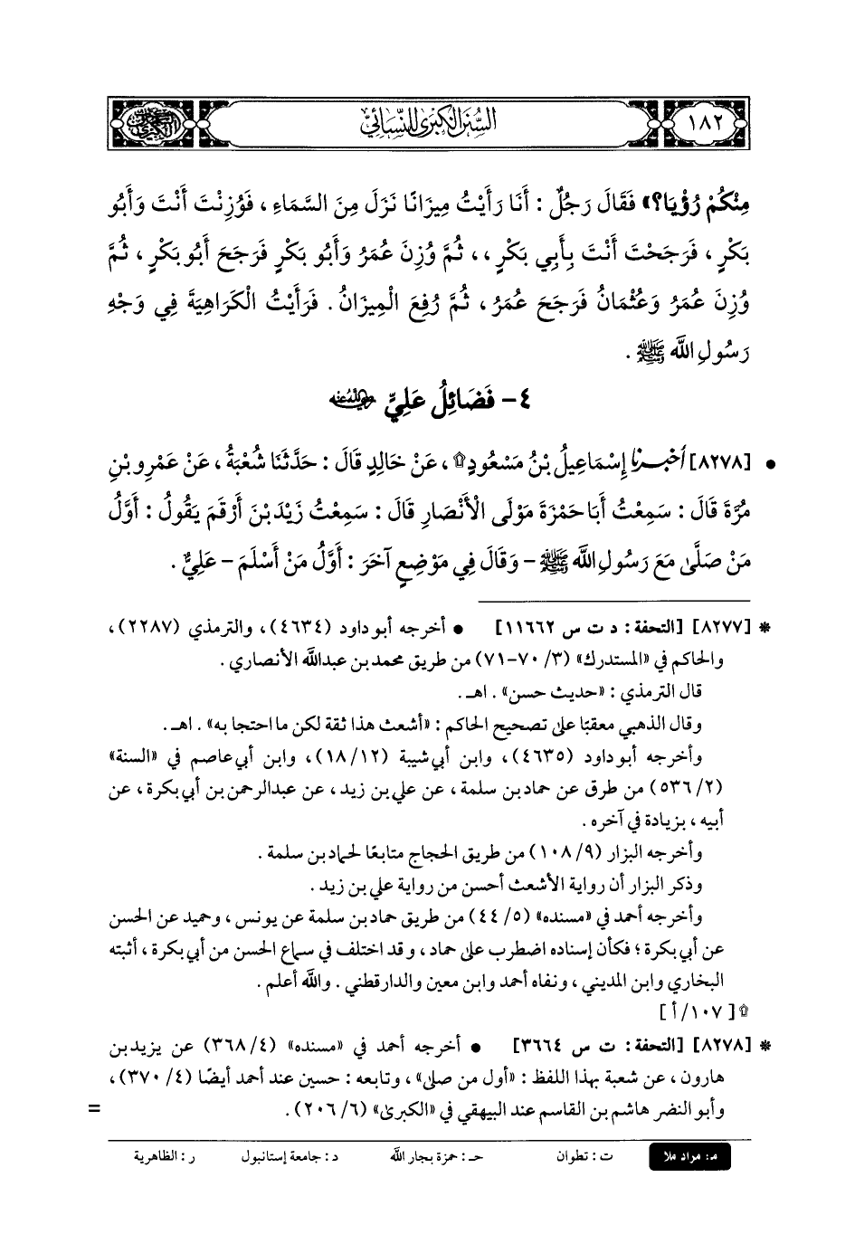 8278 - أَخبَرنا إِسمَاعِيلُ بنُ مَسْعُودٍ، عَن خَالِدٍ، قَالَ: حَدثنا شُعبَةُ، عَن عَمْرِو بنِ مُرَّةَ، قَالَ: سَمِعْتُ أَبَا حَمْزَةَ، مَوْلَى الأَنْصَارِ، قَالَ: سَمِعْتُ زَيْدَ بْنَ أَرْقَمَ يَقُولُ: أَوَّلُ مَنْ صَلَّى مَعَ رَسُولِ اللهِ صَلى الله عَلَيهِ وسَلم، وَقَالَ فِي مَوْضِعٍ آخَرَ: أَوَّلُ مَنْ أَسْلَمَ عَليٌّ.