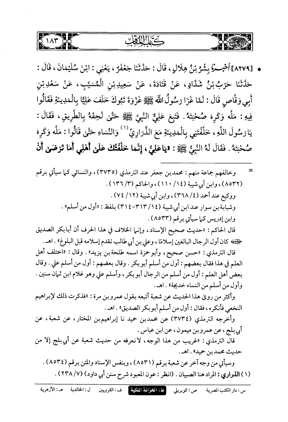 8279 - أَخبَرنا بِشْرُ بنُ هِلالٍ، قَالَ: حَدثنا جَعفَرُ، يَعْنِي ابنَ سُلَيمَانَ، قَالَ: حَدثنا حَرْبُ بنُ شَدَّادٍ، عَن قَتَادَةَ، عَن سَعِيدِ بنِ المُسَيَّبِ، عَن سَعْدِ بنِ أَبي وَقَّاصٍ قَالَ: لَمَّا غَزَا رَسُولُ اللهِ صَلى الله عَلَيهِ وسَلم غَزْوَةَ تَبُوكَ، خَلَّفَ عَليًّا بِالمَدِينَةِ، فَقَالُوا فِيهِ مَلَّهُ وَكَرِهَ صُحْبَتَهُ، فَتَبِعَ عَليٌّ النَّبيَّ صَلى الله عَلَيهِ وسَلم حَتَّى لَحِقَهُ بِالطَّرِيقِ، فَقَالَ: يَا رَسُولَ اللهِ، خَلَّفْتَنِي بِالمَدِينَةِ مَعَ الذَّرَارِيِّ وَالنِّسَاءِ، حَتَّى قَالُوا: مَلَّهُ وَكَرِهَ صُحْبَتَهُ، فَقَالَ لَهُ النَّبيُّ صَلى الله عَلَيهِ وسَلم: يَا عَليُّ، إِنَّمَا خَلَّفْتُكَ عَلَى أَهْلِي، أَمَا تَرْضَى أَنْ تَكُونَ مِنِّي بِمَنْزِلَةِ هَارُونَ مِنْ مُوسَى، غَيْرَ أَنَّهُ لا نَبِيَّ بَعْدِي؟.