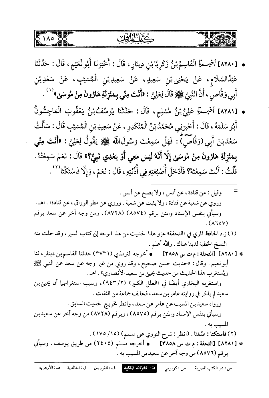 8280 - أَخبَرنا القَاسِمُ بنُ زَكَرِيَّا بنِ دِينَارٍ، قَالَ: حَدثنا أَبو نُعَيْمٍ، قَالَ: حَدثنا عَبدُ السَّلامِ، عَن يَحيَى بنِ سَعِيدٍ، عَن سَعِيدِ بنِ المُسَيَّبِ، عَن سَعْدِ بنِ أَبي وَقَّاصٍ، أَنَّ النَّبيَّ صَلى الله عَلَيهِ وسَلم قَالَ لِعَليٍّ: أَنْتَ مِنِّي بِمَنْزِلَةِ هَارُونَ مِنْ مُوسَى.
