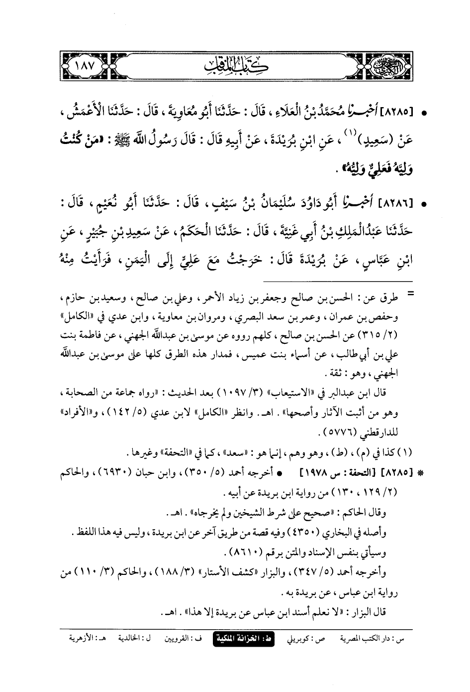 8286 - أَخبَرنا أَبو دَاوُدَ سُلَيمَانُ بنُ سَيْفٍ، قَالَ: حَدثنا أَبو نُعَيْمٍ، قَالَ: حَدثنا عَبدُ المَلِكِ بنُ أَبي غَنِيَّةَ، قَالَ: حَدثنا الحَكَمُ، عَن سَعِيدِ بنِ جُبَيْرٍ، عَنِ ابنِ عَبَّاسٍ، عَن بُرَيْدَةَ قَالَ: خَرَجْتُ مَعَ عَليٍّ إِلَى اليَمَنِ، فَرَأَيْتُ مِنْهُ جَفْوَةً، فَقَدِمْتُ عَلَى النَّبيِّ صَلى الله عَلَيهِ وسَلم، فَذَكَرْتُ عَليًّا فَتَنَقَّصْتُهُ، فَجَعَلَ رَسُولُ اللهِ صَلى الله عَلَيهِ وسَلم يَتَغَيَّرُ وَجْهُهُ، قَالَ: يَا بُرَيْدَةُ، أَلَسْتُ أَوْلَى بِالمُؤْمِنِينَ مِنْ أَنْفُسِهِمْ؟ قُلْتُ: بَلَى يَا رَسُولَ اللهِ، قَالَ: مَنْ كُنْتُ مَوْلاهُ فَعَليٌّ مَوْلاهُ.