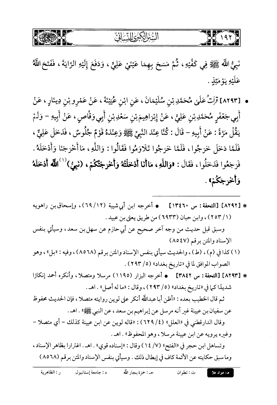 8293- قَرَأْتُ عَلَى مُحَمدِ بنِ سُلَيمَانَ، عَنِ ابنِ عُيَيْنَةَ، عَن عَمْرِو بنِ دِينَارٍ، عَن أَبي جَعفَرٍ مُحَمدِ بنِ عَليٍّ، عَن إِبْرَاهِيمَ بنِ سَعْدِ بنِ أَبي وَقَّاصٍ، عَن أَبيهِ، وَلَمْ يَقُلْ مَرَّةً عَن أَبيهِ، قَالَ: كُنَّا عِنْدَ النَّبيِّ صَلى الله عَلَيهِ وسَلم وَعِنْدَهُ قَوْمٌ جُلُوسٌ، فَدَخَلَ عَليٌّ، فَلَمَّا دَخَلَ خَرَجُوا، فَلَمَّا خَرَجُوا تَلاوَمُوا، فَقَالُوا: وَاللهِ مَا أَخَرَجَنَا وَأَدْخَلَهُ، فَرَجَعُوا، فَدَخَلُوا، فَقَالَ: وَاللهِ مَا أَنَا أَدْخَلْتُهُ وَأَخْرَجْتُكُمْ، بَلِ اللهِ (1) أَدْخَلَهُ وَأَخَرَجَكُمْ.