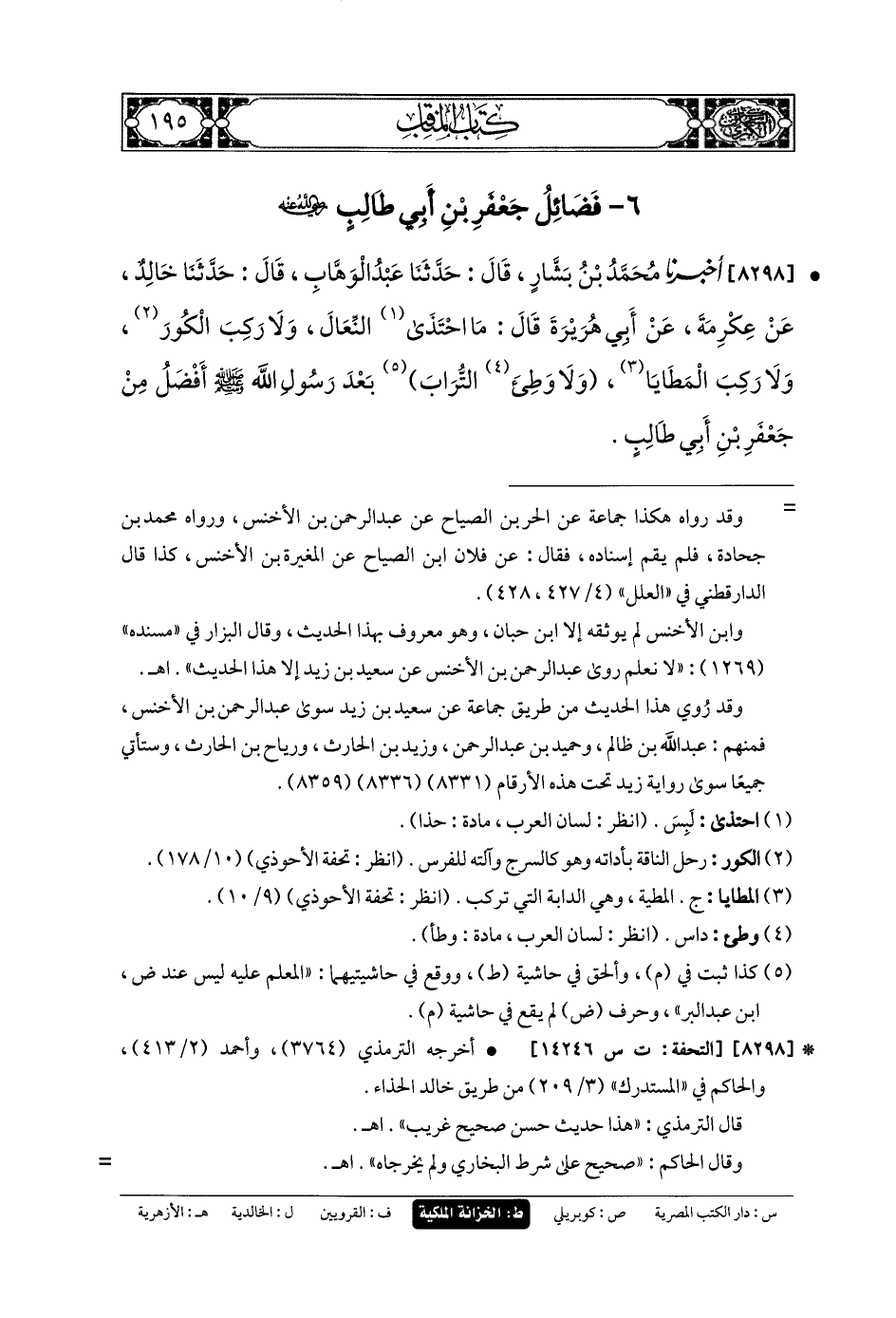 8298- أَخبَرنا مُحَمدُ بنُ بَشَّارٍ، قَالَ: حَدثنا عَبدُ الوَهَّابِ، قَالَ: حَدثنا خَالِدٌ، عَن عِكْرِمَةَ، عَن أَبي هُرَيْرَةَ قَالَ: مَا احْتَذَى النِّعَالَ، وَلا رَكِبَ الكُورَ، وَلا رَكِبَ المَطَايَا، وَلا وَطِئَ التُّرَابَ بَعْدَ رَسُولِ اللهِ صَلى الله عَلَيهِ وسَلم أَفْضَلُ مِنْ جَعفَرِ بنِ أَبي طَالِبٍ.