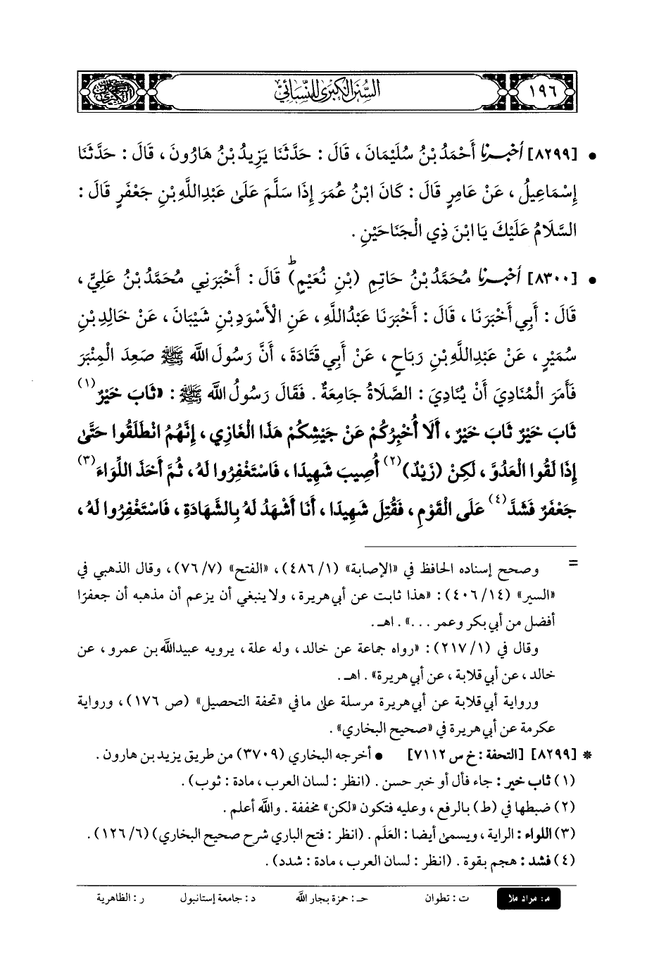 8300- أَخبَرنا مُحَمدُ بنُ حَاتِمِ بنِ نُعَيْمٍ، قَالَ: أَخْبَرَنِي مُحَمدُ بنُ عَليٍّ، قَالَ: أَبي أَخبَرنا، قَالَ: أَخبَرنا عَبدُ اللهِ، عَنِ الأَسْوَدِ بنِ شَيْبَانَ، عَن خَالِدِ بنِ سُمَيْرٍ، عَن عَبدِ اللهِ بنِ رَبَاحٍ، عَن أَبي قَتَادَةَ، أَنَّ رَسُولَ اللهِ صَلى الله عَلَيهِ وسَلم صَعِدَ المِنْبَرَ، فَأَمَرَ المُنَادِيَ أَنْ يُنَادِيَ الصَّلاةَ جَامِعَةً، فَقَالَ رَسُولُ اللهِ صَلى الله عَلَيهِ وسَلم: ثَابَ خَبَرٌ، ثَابَ خَبَرٌ، ثَابَ خَبَرٌ (1)، أَلا أُخْبِرُكُمْ عَن جَيْشِكُمْ هَذَا الغَازِي؟ إِنَّهُمُ انْطَلِقُوا حَتَّى إِذَا لَقُوَا العَدُوَّ، لَكِنَّ زَيْدٌ أُصِيبَ شَهِيدًا، فَاسْتَغْفِرُوا لَهُ، ثُمَّ أَخَذَ اللِّوَاءَ جَعفَرٌ فَشَدَّ عَلَى القَوْمِ، فَقُتِلَ شَهِيدًا، أَنَا أَشْهَدُ لَهُ بِالشَّهَادَةِ، فَاسْتَغْفِرُوا لَهُ، ثُمَّ أَخَذَ اللِّوَاءَ عَبدُ اللهِ بنُ رَوَاحَةَ، فَأَثْبَتَ قَدَمَيْهِ حَتَّى أُصِيبَ شَهِيدًا، فَاسْتَغْفِرُوا لَهُ، ثُمَّ أَخَذَ اللِّوَاءَ خَالِدُ بنُ الوَلِيدِ، وَلَمْ يَكُنْ مِنَ الأُمَرَاءِ، فَرَفَعَ رَسُولُ اللهِ صَلى الله عَلَيهِ وسَلم ضَبْعَيْهِ، وَقَالَ: اللهُمَّ هَذَا سَيْفٌ مِنْ سُيُوفِكَ، فَانْتَصِرْ بِهِ، فَيَوْمَئِذٍ سُمَيَّ خَالِدٌ سَيْفَ اللهِ.