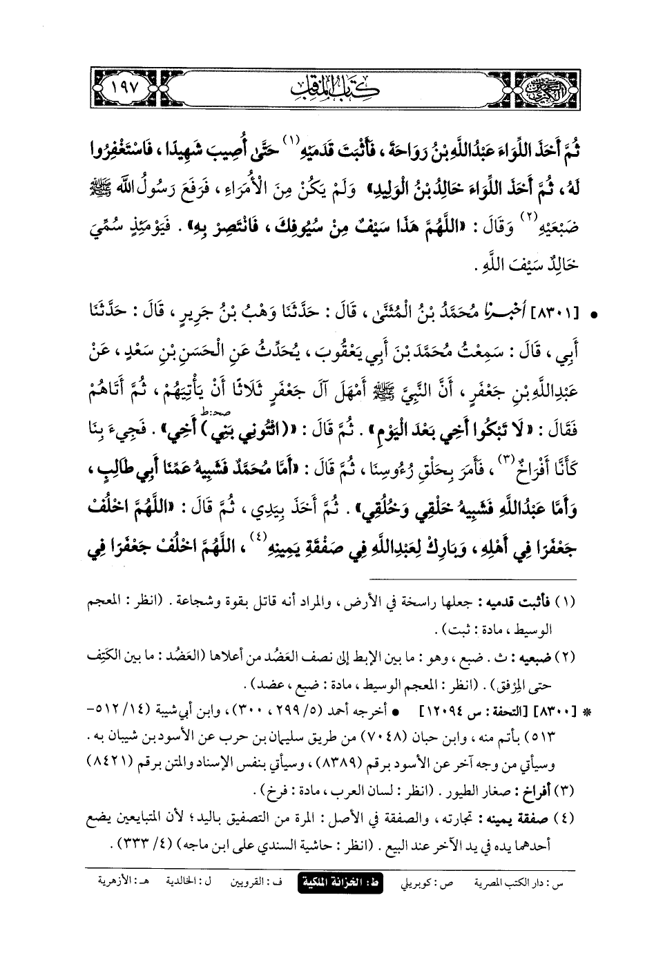 8301- أَخبَرنا مُحَمدُ بنُ المُثَنَّى، قَالَ: حَدثنا وَهْبُ بنُ جَرِيرٍ، قَالَ: حَدثنا أَبي، قَالَ: سَمِعْتُ مُحَمدَ بْنَ أَبي يَعْقُوبَ يُحَدِّثُ عَنِ الحَسَنِ بنِ سَعْدٍ، عَن عَبدِ اللهِ بنِ جَعفَرٍ، أَنَّ النَّبيَّ صَلى الله عَلَيهِ وسَلم أَمْهَلَ آلَ جَعفَرٍ ثَلاثًا أَنْ يَأْتِيَهُمْ، ثُمَّ أَتَاهُمْ فَقَالَ: لا تَبْكُوا أَخِي بَعْدَ اليَوْمِ، ثُمَّ قَالَ: ائتُونِي بَنِي أَخِي، فَجِيءَ بِنَا كَأَنَّا أَفْرَاخٌ، فَأَمَرَ بِحَلْقِ رُؤوسِنَا، ثُمَّ قَالَ: أَمَّا مُحَمدٌ فَشَبِيهُ عَمِّنَا أَبي طَالِبٍ، وَأَمَّا عَبدُ اللهِ فَشَبِيهُ خَلْقِي وَخُلُقِي، ثُمَّ أَخَذَ بِيَدَيَّ، ثُمَّ قَالَ: اللهُمَّ اخْلُفْ جَعفَرًا فِي أَهْلِهِ، وَبَارِكْ لِعَبدِ اللهِ فِي صَفْقَةِ يَمِينِهِ، اللهُمَّ اخْلُفْ جَعفَرًا فِي أَهْلِهِ، وَبَارِكْ لِعَبدِ اللهِ فِي صَفْقَةِ يَمِينِهِ، اللهُمَّ اخْلُفْ جَعفَرًا فِي أَهْلِهِ، وَبَارِكْ لِعَبدِ اللهِ فِي صَفْقَةِ يَمِينِهِ.