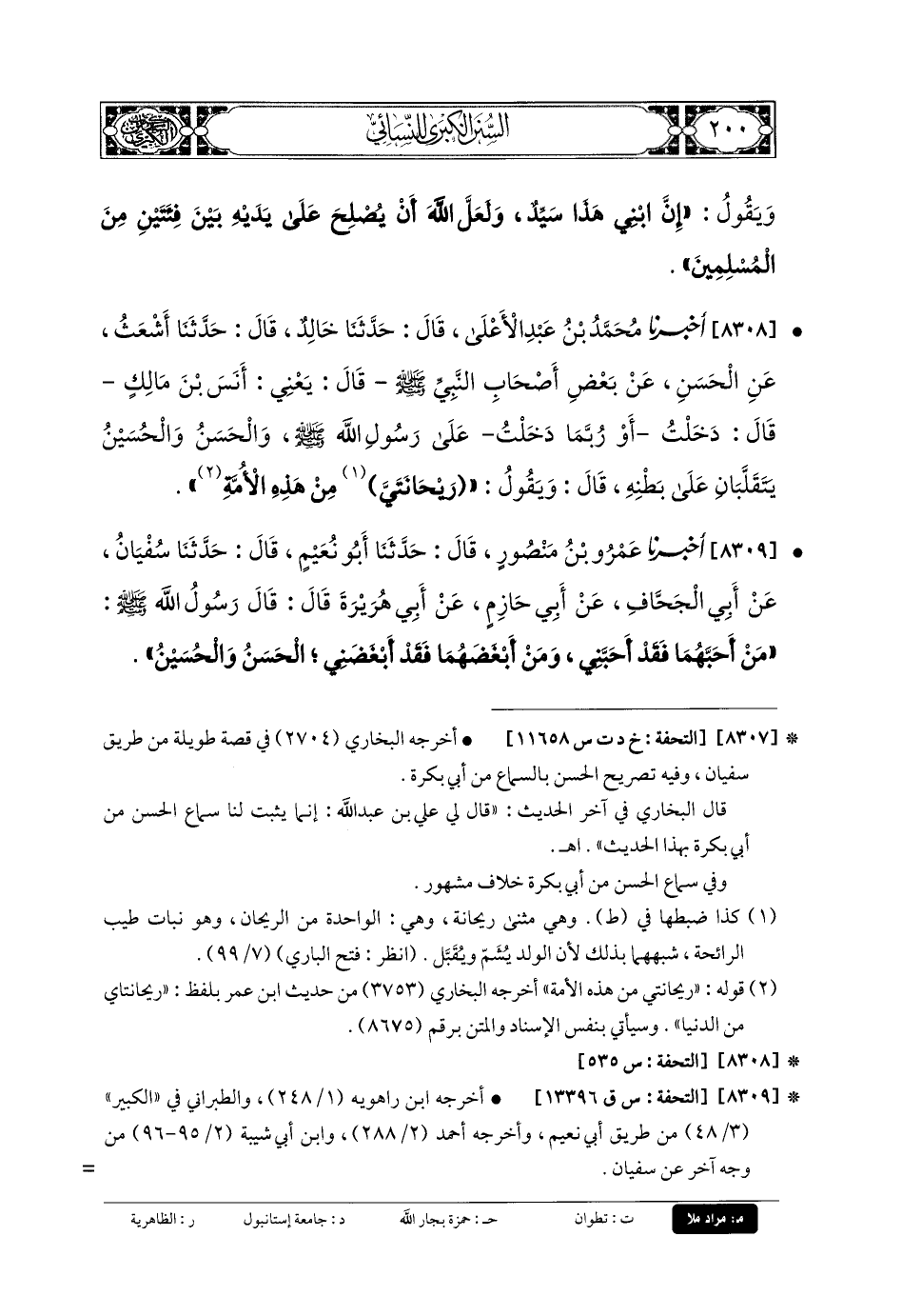 8309- أَخبَرنا عَمْرُو بنُ مَنصُورٍ، قَالَ: حَدثنا أَبو نُعَيْمٍ، قَالَ: حَدثنا سُفيانُ، عَن أَبي الجَحَّافِ، عَن أَبي حَازِمٍ، عَن أَبي هُرَيْرَةَ قَالَ: قَالَ رَسُولُ اللهِ صَلى الله عَلَيهِ وسَلم: مَنْ أَحَبَّهُمَا فَقَدْ أَحَبَّنِي، وَمَنْ أَبْغَضَهُمَا فَقَدْ أَبْغَضَنِي، الحَسَنُ وَالحُسَيْنُ.