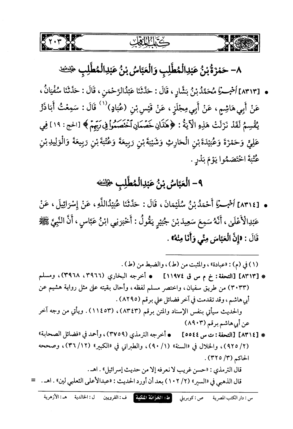 8314- أَخبَرنا أَحْمَدُ بنُ سُلَيمَانَ، قَالَ: حَدثنا عُبَيدُ اللهِ، عَن إِسرَائِيلَ، عَن عَبدِ الأَعْلَى، أَنَّهُ سَمِعَ سَعِيدَ بْنَ جُبَيْرٍ يَقُولُ: أَخْبَرَنِي ابنُ عَبَّاسٍ، أَنَّ النَّبيَّ صَلى الله عَلَيهِ وسَلم قَالَ: إِنَّ العَبَّاسَ مِنِّي، وَأَنَا مِنْهُ.