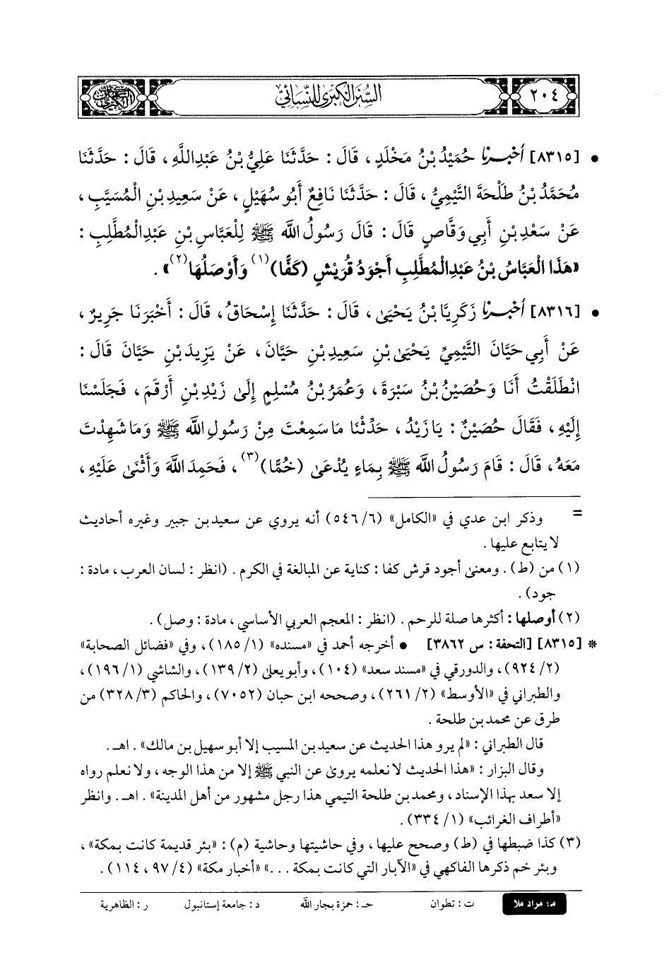 8315- أَخبَرنا حُمَيْدُ بنُ مَخْلَدٍ، قَالَ: حَدثنا عَليُّ بنُ عَبدِ اللهِ، قَالَ: حَدثنا مُحَمدُ بنُ طَلحَةَ التَّيْمِيُّ، قَالَ: حَدثنا نَافِعٌ أَبو سُهَيلٍ، عَن سَعِيدِ بنِ المُسَيَّبِ، عَن سَعْدِ بنِ أَبي وَقَّاصٍ قَالَ: قَالَ رَسُولُ اللهِ صَلى الله عَلَيهِ وسَلم لِلْعَبَّاسِ بنِ عَبدِ المُطَّلِبِ: هَذَا العَبَّاسُ بنُ عَبدِ المُطَّلِبِ أَجْوَدُ قُرَيْشٍ كَفًّا وَأَوْصَلُهَا.
