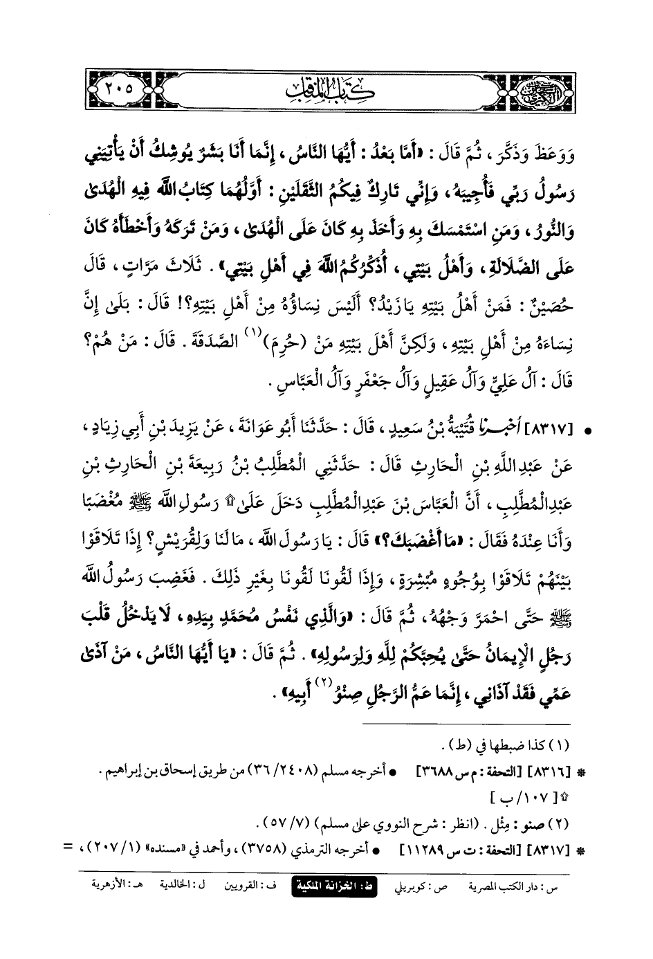 8317- أَخبَرنا قُتَيبَةُ بنُ سَعِيدٍ، قَالَ: أَخبَرنا أَبو عَوَانَةَ، عَن يَزِيدَ بنِ أَبي زِيَادٍ، عَن عَبدِ اللهِ بنِ الحَارِثِ، قَالَ: حَدَّثني المُطَّلِبُ بنُ رَبِيعَةَ بنِ الحَارِثِ بنِ عَبدِ المُطَّلِبِ، أَنَّ العَبَّاسَ بْنَ عَبدِ المُطَّلِبِ دَخَلَ عَلَى رَسُولِ اللهِ صَلى الله عَلَيهِ وسَلم مُغْضَبًا، وَأَنَا عِنْدَهُ، فَقَالَ: مَا أَغْضَبَكَ؟ قَالَ: يَا رَسُولَ اللهِ، مَا لَنَا وَلِقُرَيْشٍ، إِذَا تَلاقَوْا بَيْنَهُمْ تَلاقَوْا بِوُجُوهٍ مُبْشِرَةٍ، وَإِذَا لَقُونَا لَقُونَا بِغَيْرِ ذَلِكَ، فَغَضِبَ رَسُولُ اللهِ صَلى الله عَلَيهِ وسَلم حَتَّى احْمَرَّ وَجْهُهُ، ثُمَّ قَالَ: وَالَّذِي نَفْسُ مُحَمدٍ بِيَدِهِ، لا يَدْخُلُ قَلْبَ رَجُلٍ الإِيمَانُ حَتَّى يُحِبَّكُمْ للهِ وَلِرَسُولِهِ، ثُمَّ قَالَ: يَا أَيُّهَا النَّاسُ، مَنْ آذَى عَمِّي فَقَدْ آذَانِي، إِنَّمَا عَمُّ الرَّجُلِ صِنْوُ أَبيهِ.
