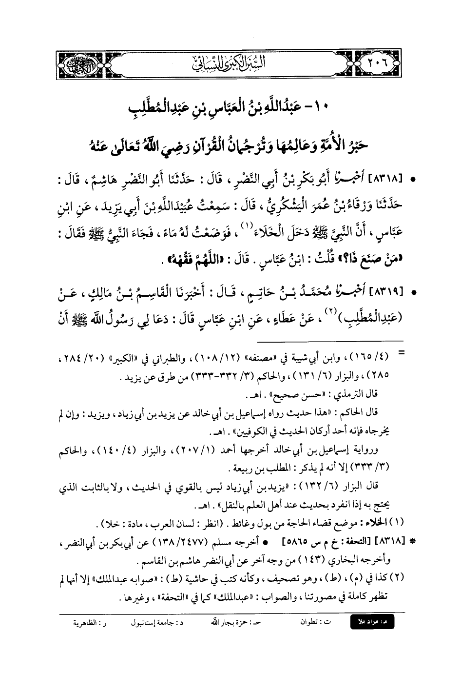 8318- أَخبَرنا أَبو بَكْرِ بنُ أَبي النَّضْرِ، قَالَ: حَدثنا أَبو النَّضْرِ هَاشِمٌ، قَالَ: حَدثنا وَرْقَاءُ بنُ عُمَرَ اليَشْكُرِيُّ، قَالَ: سَمِعْتُ عُبَيدَ اللهِ بْنَ أَبي يَزِيدَ، عَنِ ابنِ عَبَّاسٍ، أَنَّ النَّبيَّ صَلى الله عَلَيهِ وسَلم دَخَلَ الخَلاءَ، فَوَضَعْتُ لَهُ مَاءً، فَجَاءَ النَّبيُّ صَلى الله عَلَيهِ وسَلم فَقَالَ: مَنْ صَنَعَ ذَا؟ قُلْتُ: ابنُ عَبَّاسٍ قَالَ: اللهُمَّ فَقِّهْهُ.