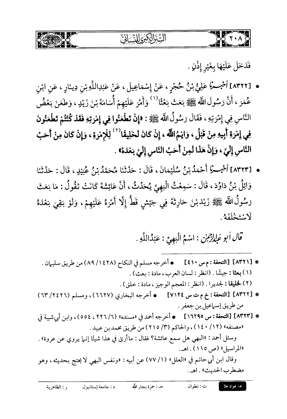 8323- أَخبَرنا أَحْمَدُ بنُ سُلَيمَانَ، قَالَ: حَدثنا مُحَمدُ بنُ عُبَيدٍ، قَالَ: حَدثنا وَائِلُ بنُ دَاوُدَ، قَالَ: سَمِعْتُ البَهِيَّ يُحَدِّثُ أَنَّ عَائِشَةَ كَانَتْ تَقُولُ: مَا بَعَثَ رَسُولُ اللهِ صَلى الله عَلَيهِ وسَلم زَيْدَ بْنَ حَارِثَةَ فِي جَيْشٍ قَطُّ إِلاَّ أَمَّرَهُ عَلَيْهِمْ، وَلَوْ بَقِيَ بَعْدَهُ لاسْتَخْلَفَهُ.