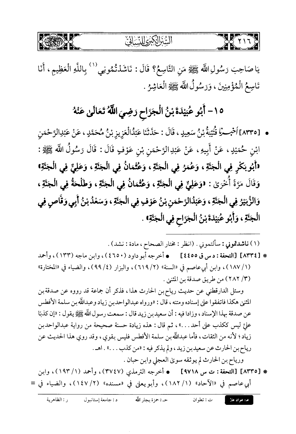 8335- أَخبَرنا قُتَيبَةُ بنُ سَعِيدٍ، قَالَ: أَخبَرنا عَبدُ العَزِيزِ بنُ مُحَمدٍ، عَن عَبدِ الرَّحمَنِ بنِ حُمَيْدٍ، عَن أَبيهِ، عَن عَبدِ الرَّحمَنِ بنِ عَوْفٍ قَالَ: قَالَ رَسُولُ اللهِ صَلى الله عَلَيهِ وسَلم: أَبو بَكْرٍ فِي الجَنَّةِ، وَعُمَرُ فِي الجَنَّةِ، وَعُثْمَانُ فِي الجَنَّةِ، وَعَليٌّ فِي الجَنَّةِ، وَقَالَ مَرَّةً أُخْرَى: وَعَليٌّ فِي الجَنَّةِ، وَعُثْمَانُ فِي الجَنَّةِ، وَطَلحَةُ فِي الجَنَّةِ، وَالزُّبَيْرُ فِي الجَنَّةِ، وَعَبدُ الرَّحمَنِ بنُ عَوْفٍ فِي الجَنَّةِ، وَسَعْدُ بنُ أَبي وَقَّاصٍ فِي الجَنَّةِ، وَأَبو عُبَيدَةَ بنُ الجَرَّاحِ فِي الجَنَّةِ.