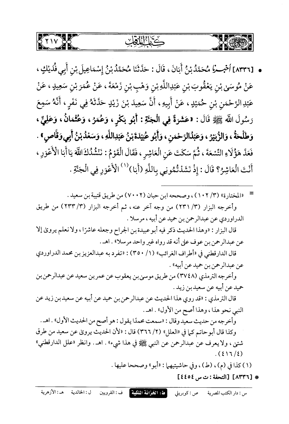 8336- أَخبَرنا مُحَمدُ بنُ أَبَانَ، قَالَ: حَدثنا مُحَمدُ بنُ إِسمَاعِيلَ بنِ أَبي فُدَيْكٍ، عَن مُوسَى بنِ يَعْقُوبَ بنِ عَبدِ اللهِ بنِ وَهْبِ بنِ زَمْعَةَ، عَن عُمَرَ بنِ سَعِيدٍ، عَن عَبدِ الرَّحمَنِ بنِ حُمَيْدٍ، عَن أَبيهِ، أَنَّ سَعِيدَ بْنَ زَيْدٍ حَدَّثَهُ فِي نَفَرٍ، أَنَّهُ سَمِعَ رَسُولَ اللهِ صَلى الله عَلَيهِ وسَلم قَالَ: عَشْرَةٌ فِي الجَنَّةِ: أَبو بَكْرٍ، وَعُمَرُ، وَعُثْمَانُ، وَعَليٌّ، وَطَلحَةُ، وَالزُّبَيْرُ، وَعَبدُ الرَّحمَنِ، وَأَبو عُبَيدَةَ بنُ عَبدِ اللهِ، وَسَعْدُ بنُ أَبي وَقَّاصٍ قَالَ: فَعَدَّ هَؤُلاءِ التِّسْعَةَ، ثُمَّ سَكَتَ عَنِ العَاشِرِ، فَقَالَ القَوْمُ: نَنْشُدُكَ اللهَ يَا أَبَا الأَعْوَرِ، أَنْتَ العَاشِرُ؟ قَالَ: إِذْ نَشَدْتُمُونِي بِاللهِ، أَبو (1) الأَعْوَرِ فِي الجَنَّةِ.