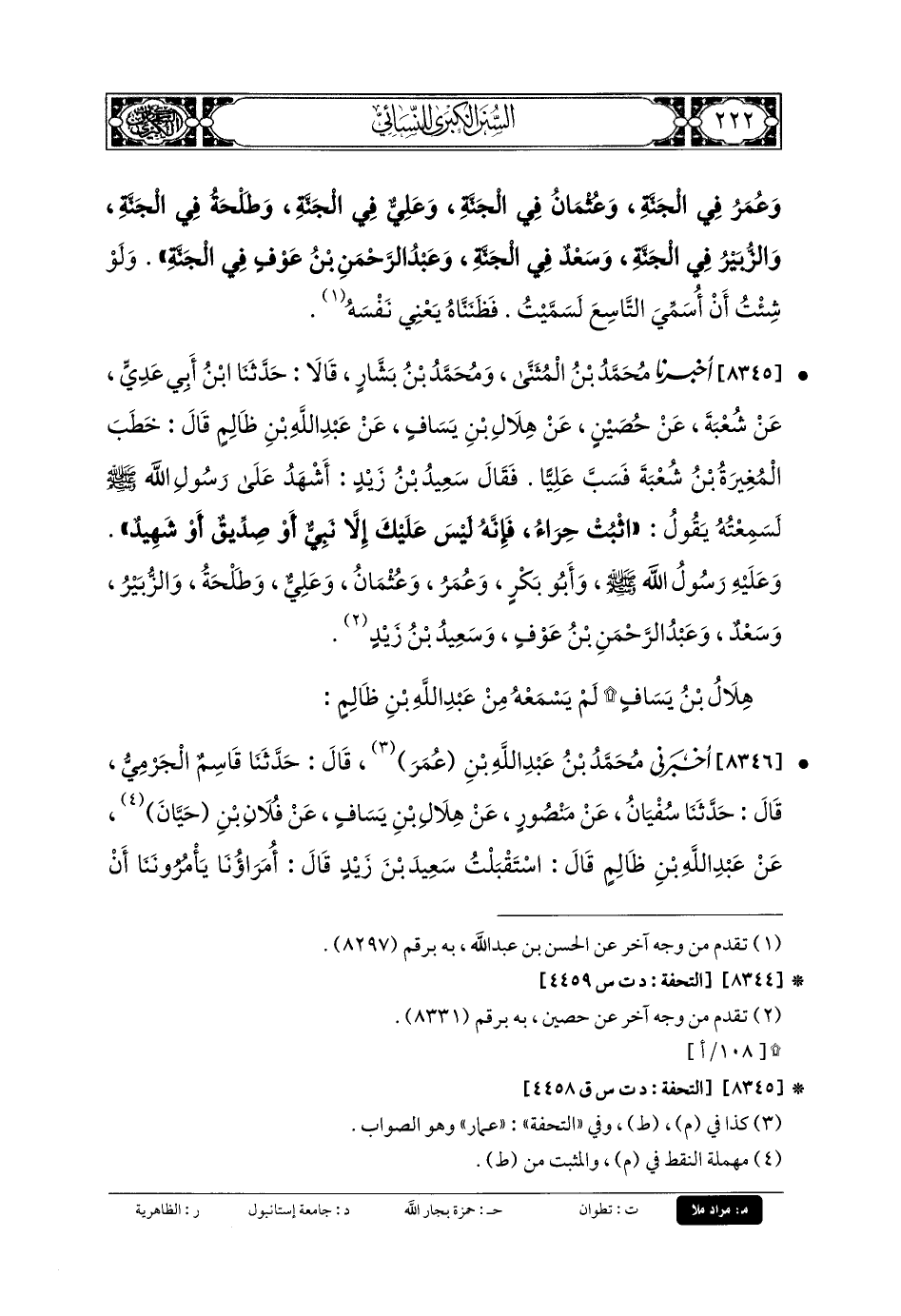 8345- أَخبَرنا مُحَمدُ بنُ المُثَنَّى، وَمُحَمدُ بنُ بَشَّارٍ، قَالا: حَدثنا ابنُ أَبي عَدِيٍّ، عَن شُعبَةَ، عَن حُصَيْنٍ، عَن هِلالِ بنِ يَسَافٍ، عَن عَبدِ اللهِ بنِ ظَالِمٍ قَالَ: خَطَبَ المُغِيرَةُ بنُ شُعبَةَ فَسَبَّ عَليًّا، فَقَالَ سَعِيدُ بنُ زَيْدٍ: أَشْهَدُ عَلَى رَسُولِ اللهِ صَلى الله عَلَيهِ وسَلم لَسَمِعْتُهُ يَقُولُ: اثْبُتْ حِرَاءُ، فَإِنَّهُ لَيْسَ عَلَيْكَ إِلاَّ نَبِيٌّ، أَوْ صِدِّيقٌ، أَوْ شَهِيدٌ، وَعَلَيْهِ رَسُولُ اللهِ صَلى الله عَلَيهِ وسَلم، وَأَبو بَكْرٍ، وَعُمَرُ، وَعُثْمَانُ، وَعَليٌّ، وَطَلحَةُ، وَالزُّبَيْرُ، وَسَعْدٌ، وَعَبدُ الرَّحمَنِ بنُ عَوْفٍ، وَسَعِيدُ بنُ زَيْدٍ.