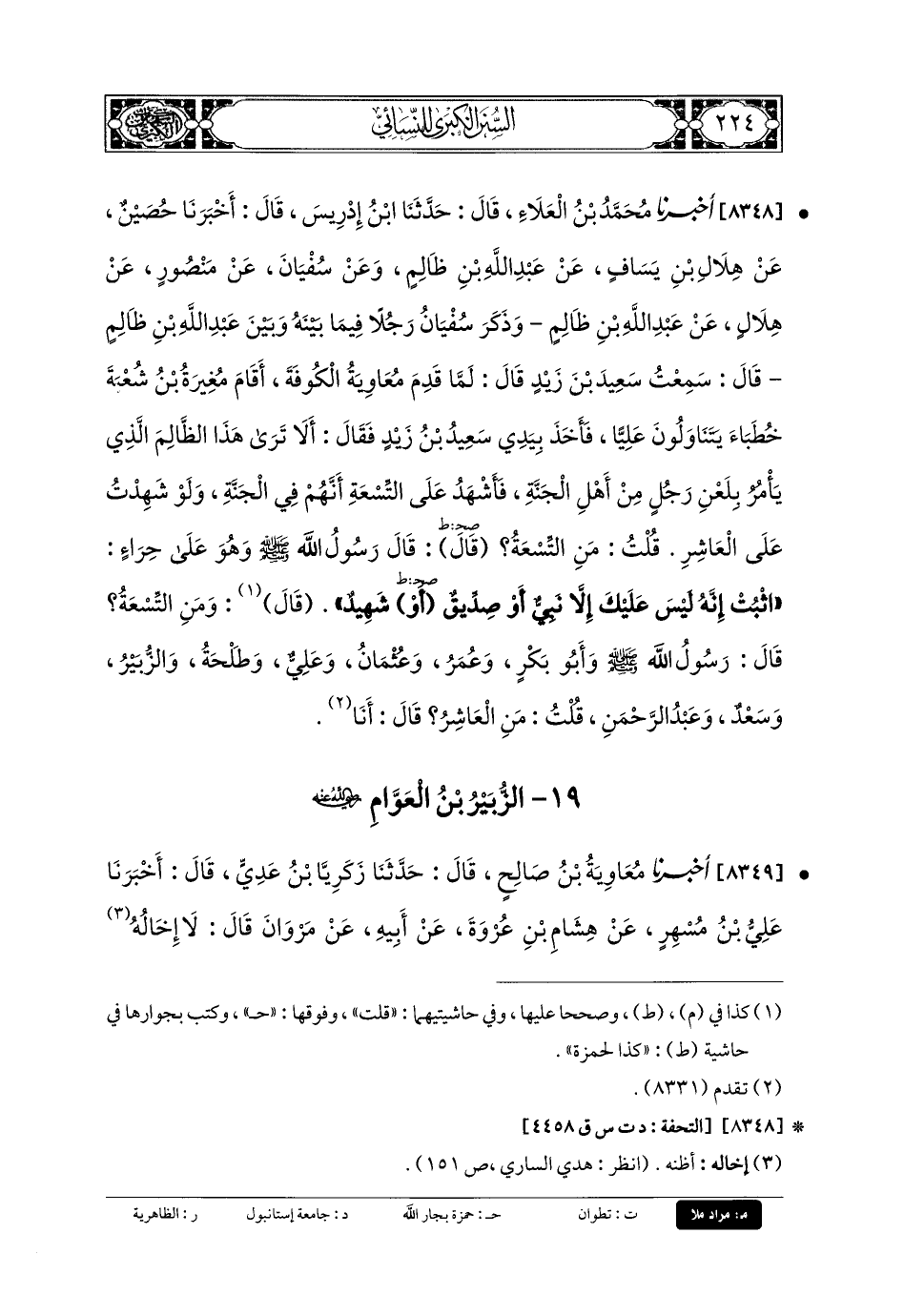 8348- أَخبَرنا مُحَمدُ بنُ العَلاءِ، قَالَ: حدثنا ابنُ إِدْرِيسَ، قَالَ: أَخبَرنا حُصَيْنٌ، عَن هِلالِ بنِ يَسَافٍ، عَن عَبدِ اللهِ بنِ ظَالِمٍ، وَعَن سُفيانَ، عَن مَنصُورٍ، عَن هِلالٍ، عَن عَبدِ اللهِ بنِ ظَالِمٍ، وَذَكَرَ سُفيانُ رَجُلاً فِيمَا بَيْنَهُ وَبَيْنَ عَبدِ اللهِ بنِ ظَالِمٍ، قَالَ: سَمِعْتُ سَعِيدَ بنِ زَيْدٍ قَالَ: لَمَّا قَدِمَ مُعاويَةُ الكُوفَةَ، أَقَامَ مُغِيرَةُ بنُ شُعبَةَ خُطَبَاءَ يَتَنَاوَلُونَ عَليًّا، فَأَخَذَ بِيَدِي سَعِيدُ بنُ زَيْدٍ فَقَالَ: أَلا تَرَى هَذَا الظَّالِمَ الَّذِي يَأْمُرُ بِلَعْنِ رَجُلٍ مِنْ أَهْلِ الجَنَّةِ، فَأَشْهَدُ عَلَى التِّسْعَةِ أَنَّهُمْ فِي الجَنَّةِ، وَلَوْ شَهِدْتُ عَلَى العَاشِرِ، قُلْتُ: مَنِ التِّسْعَةُ؟ قَالَ: قَالَ رَسُولُ اللهِ صَلى الله عَلَيهِ وسَلم وَهُوَ عَلَى حِرَاءَ: اثْبُتْ إِنَّهُ لَيْسَ عَلَيْكَ إِلاَّ نَبِيٌّ، أَوْ صِدِّيقٌ، أَوْ شَهِيدٌ، قَالَ: وَمَنِ التِّسْعَةُ؟ قَالَ رَسُولُ اللهِ صَلى الله عَلَيهِ وسَلم، وَأَبو بَكْرٍ، وَعُمَرُ، وَعُثْمَانُ، وَعَليٌّ، وَطَلحَةُ، وَالزُّبَيْرُ، وَسَعْدٌ، وَعَبدُ الرَّحمَنِ، قُلْتُ: مَنِ العَاشِرُ قَالَ: أَنَا.
