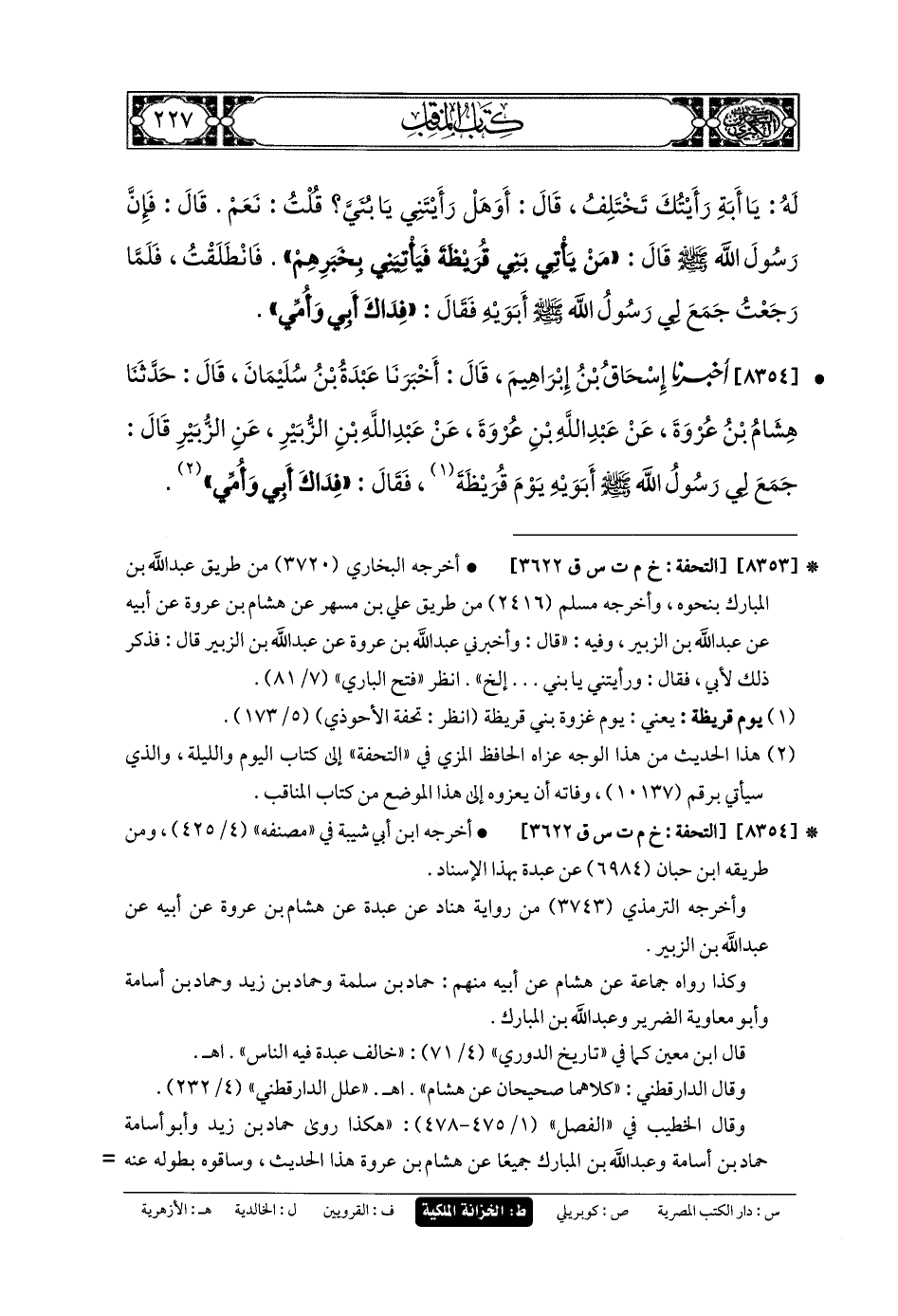 8354- أَخبَرنا إِسحَاقُ بنُ إِبْرَاهِيمَ، قَالَ: حَدثنا عَبدَةُ بنُ سُلَيمَانَ، قَالَ: حَدثنا هِشَامُ بنُ عُرْوَةَ، عَن عَبدِ اللهِ بنِ عُرْوَةَ، عَن عَبدِ اللهِ بنِ الزُّبَيْرِ، عَنِ الزُّبَيْرِ قَالَ: جَمَعَ لِي رَسُولُ اللهِ صَلى الله عَلَيهِ وسَلم أَبَوَيْهِ يَوْمَ قُرَيْظَةَ، فَقَالَ: فِدَاكَ أَبي وَأُمِّي.