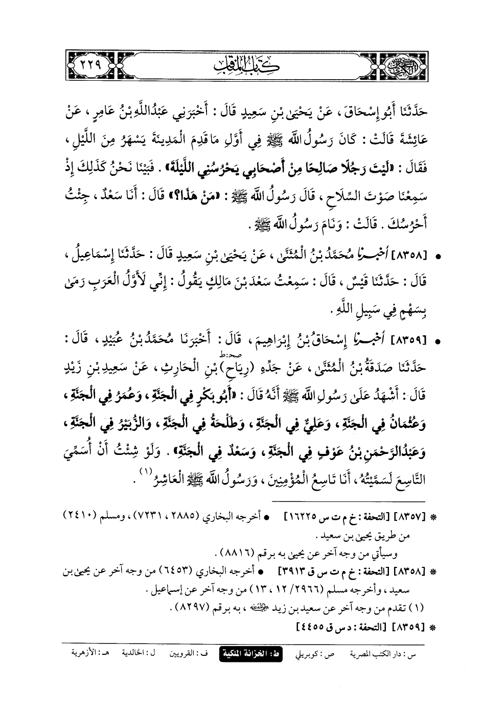 8359- أَخبَرنا إِسحَاقُ بنُ إِبْرَاهِيمَ، قَالَ: أَخبَرنا مُحَمدُ بنُ عُبَيدٍ، قَالَ: حَدثنا صَدَقَةُ بنُ المُثَنَّى، عَن جَدِّهِ رِيَاحِ بنِ الحَارِثِ، عَن سَعِيدِ بنِ زَيْدٍ قَالَ: أَشْهَدُ عَلَى رَسُولِ اللهِ صَلى الله عَلَيهِ وسَلم أَنَّهُ قَالَ: أَبو بَكْرٍ فِي الجَنَّةِ، وَعُمَرُ فِي الجَنَّةِ، وَعُثْمَانُ فِي الجَنَّةِ، وَعَليٌّ فِي الجَنَّةِ، وَطَلحَةُ فِي الجَنَّةِ، وَالزُّبَيْرُ فِي الجَنَّةِ، وَعَبدُ الرَّحمَنِ بنُ عَوْفٍ فِي الجَنَّةِ، وَسَعْدٌ فِي الجَنَّةِ، وَلَوْ شِئْتُ أَنْ أُسَمِّيَ التَّاسِعَ لَسَمَّيْتُهُ، أَنَا تَاسِعُ المُؤْمِنِينَ، وَرَسُولُ اللهِ صَلى الله عَلَيهِ وسَلم العَاشِرُ.