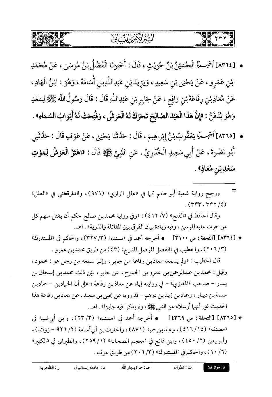 8365- أَخبَرنا يَعْقُوبُ بنُ إِبْرَاهِيمَ، قَالَ: حَدثنا يَحيَى، عَن عَوْفٍ، قَالَ: حَدَّثني أَبو نَضْرَةَ، عَن أَبي سَعِيدٍ الخُدْرِيِّ، عَنِ النَّبيِّ صَلى الله عَلَيهِ وسَلم قَالَ: اهْتَزَّ العَرْشُ لِمَوْتِ سَعْدِ بنِ مُعَاذٍ.