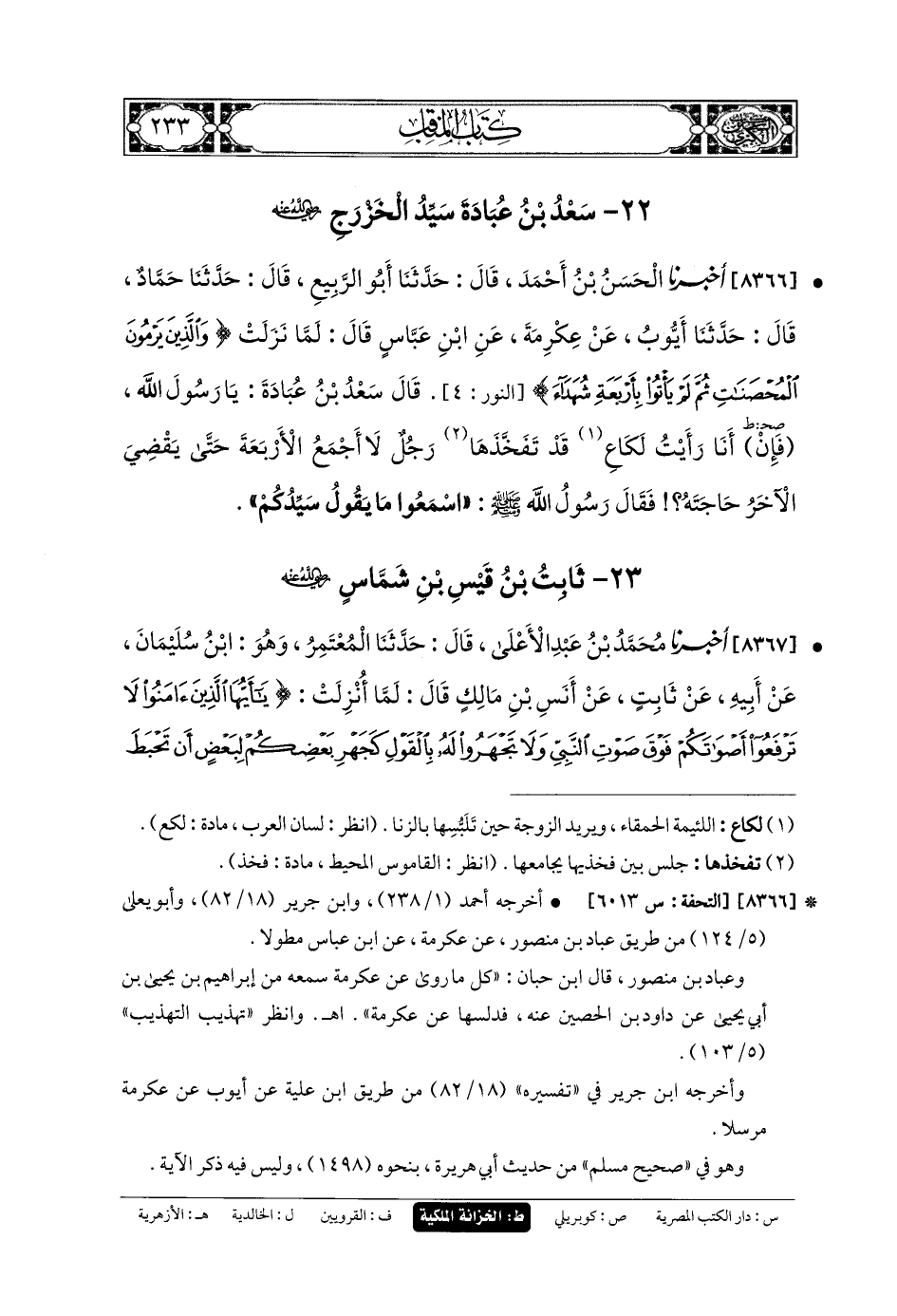 8366 - أَخبَرنا الحَسَنُ بنُ أَحْمَدَ، قَالَ: حَدثنا أَبو الرَّبِيعِ، قَالَ: حَدثنا حَمَّادٌ، قَالَ: حَدثنا أَيوبُ، عَن عِكْرِمَةَ، عَنِ ابنِ عَبَّاسٍ قَالَ: لَمَّا نَزَلَتْ: {وَالَّذِينَ يَرْمُونَ المُحْصَنَاتِ ثُمَّ لَمْ يَأْتُوا بِأَرْبَعَةِ شُهَدَاءَ} قَالَ سَعْدُ بنُ عِبَادَةَ: يَا رَسُولَ اللهِ، فَإِنْ أَنَا رَأَيْتُ لَكَاعِ قَدْ تَفَخَّذَهَا رَجُلٌ، لا أَجْمَعُ الأَرْبَعَةَ حَتَّى يَقْضِيَ الآخَرُ حَاجَتَهُ، فَقَالَ رَسُولُ اللهِ صَلى الله عَلَيهِ وسَلم: اسْمَعُوا مَا يَقُولُ سَيِّدُكُمْ.