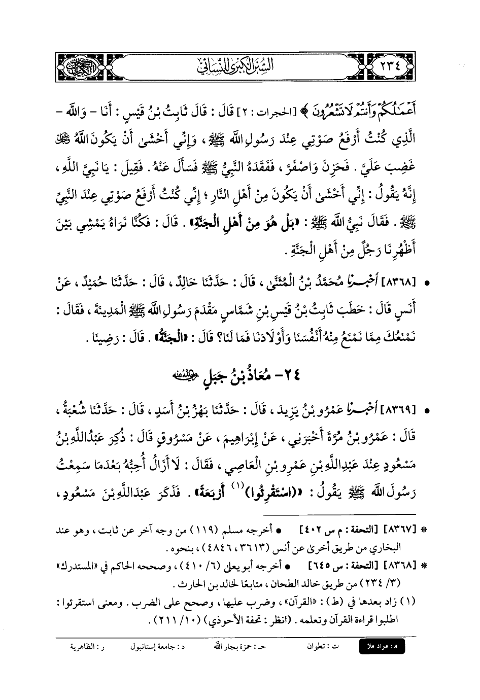 8368- أَخبَرنا مُحَمدُ بنُ المُثَنَّى، قَالَ: حَدثنا خَالِدٌ، قَالَ: حَدثنا حُمَيْدٌ، عَن أَنَسٍ قَالَ: خَطَبَ ثَابِتُ بنُ قَيْسِ بنِ شَمَّاسٍ مَقْدَمَ رَسُولِ اللهِ صَلى الله عَلَيهِ وسَلم المَدِينَةَ فَقَالَ: نَمْنَعُكَ مِمَّا نَمْنَعُ مِنْهُ أَنْفُسَنَا وَأَوْلادَنَا، فَمَا لَنَا؟ قَالَ: الجَنَّةُ، قَالَ: رَضِينَا.