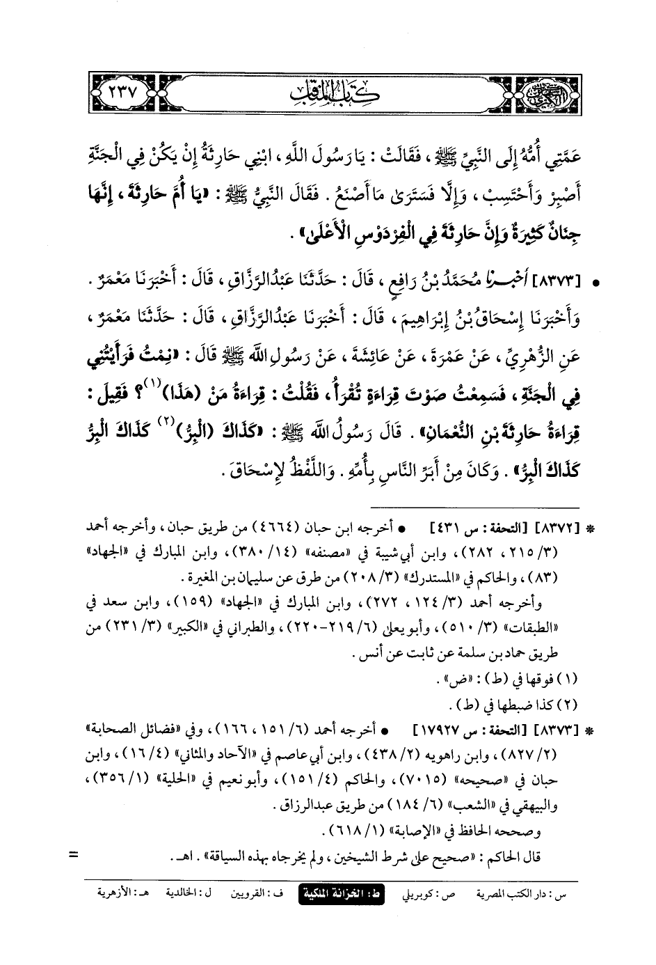 8373- أَخبَرنا مُحَمدُ بنُ رَافِعٍ، قَالَ: حَدثنا عَبدُ الرَّزَّاقِ، قَالَ: أَخبَرنا مَعْمَرٌ (ح) وَأَخبَرنا إِسحَاقُ بنُ إِبْرَاهِيمَ، قَالَ: أَخبَرنا عَبدُ الرَّزَّاقِ، قَالَ: حَدثنا مَعْمَرٌ، عَنِ الزُّهْرِيِّ، عَن عَمْرَةَ، عَن عَائِشَةَ، عَن رَسُولِ اللهِ صَلى الله عَلَيهِ وسَلم قَالَ: نِمْتُ فَرَأَيْتُنِي فِي الجَنَّةِ، فَسَمِعْتُ صَوْتَ قِرَاءَةٍ تُقْرَأُ، فَقُلْتُ: قِرَاءَةُ مَنْ هَذَا؟ فَقِيلَ: قِرَاءَةُ حَارِثَةَ بنِ النُّعْمَانِ، قَالَ رَسُولُ اللهِ صَلى الله عَلَيهِ وسَلم: كَذَاكَ البِرُّ، كَذَاكَ البِرُّ، كَذَاكَ البِرُّ، وَكَانَ مِنْ أَبَّرِ النَّاسِ بِأُمِّهِ