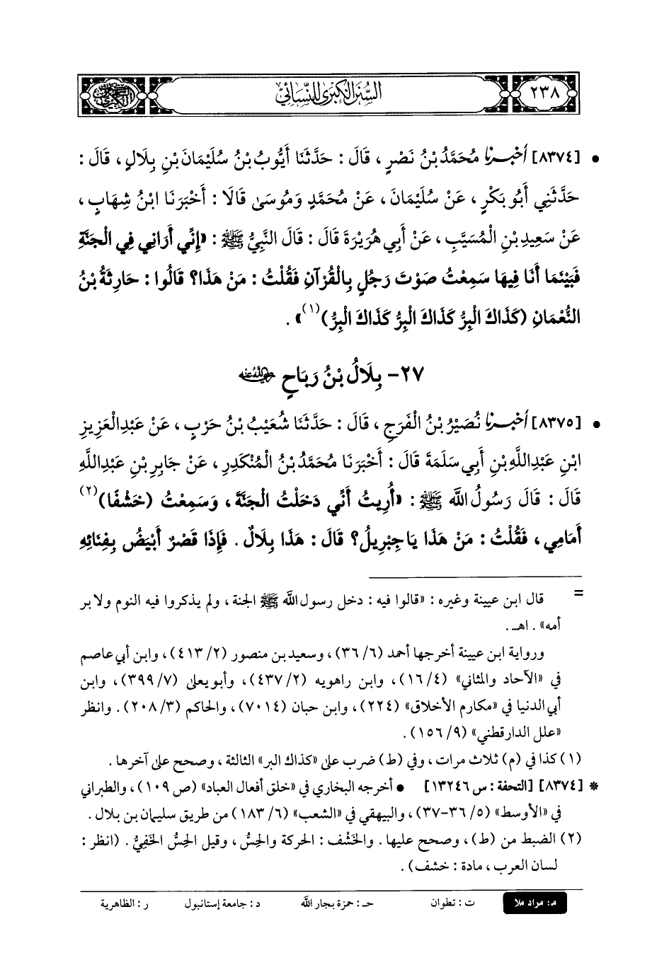 8375- أَخبَرنا نُصَيْرُ بنُ الفَرَجِ، قَالَ: حَدثنا شُعَيْبُ بنُ حَرْبٍ، عَن عَبدِ العَزِيزِ بنِ عَبدِ اللهِ بنِ أَبي سَلَمَةَ، قَالَ: أَخبَرنا مُحَمدُ بنُ المُنْكَدِرِ، عَن جَابِرِ بنِ عَبدِ اللهِ قَالَ: قَالَ رَسُولُ اللهِ صَلى الله عَلَيهِ وسَلم: أُرِيتُ أَنِّي دَخَلْتُ الجَنَّةَ، وَسَمِعْتُ خَشْفًا أَمَامِي، فَقُلْتُ: مَنْ هَذَا يَا جِبْرِيلُ؟ قَالَ: هَذَا بِلالٌ، فَإِذَا قَصْرٌ أَبْيَضُ بِفِنَائِهِ جَارِيَةٌ، فَقُلْتُ: لِمَنْ هَذَا يَا جِبْرِيلُ؟ قَالَ: هَذَا لِعُمَرَ بنِ الخَطَّابِ.