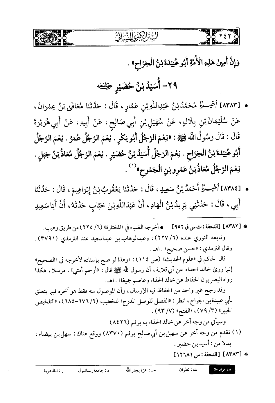 8383- أَخبَرنا مُحَمدُ بنُ عَبدِ اللهِ بنِ عَمَّارٍ، قَالَ: حَدثنا مُعَافَى بنُ عِمْرَانَ، عَن سُلَيمَانَ بنِ بِلالٍ، عَن سُهَيلِ بنِ أَبي صَالِحٍ، عَن أَبيهِ، عَن أَبي هُرَيْرَةَ قَالَ: قَالَ رَسُولُ اللهِ صَلى الله عَلَيهِ وسَلم: نِعْمَ الرَّجُلُ أَبو بَكْرٍ، نِعْمَ الرَّجُلُ عُمَرُ، نِعْمَ الرَّجُلُ أَبو عُبَيدَةَ بنُ الجَرَّاحِ، نِعْمَ الرَّجُلُ أُسَيْدُ بنُ حُضَيْرٍ، نِعْمَ الرَّجُلُ مُعَاذُ بنُ جَبَلٍ، نِعْمَ الرَّجُلُ مُعَاذُ بنُ عَمْرِو بنِ الجَمُوحِ.