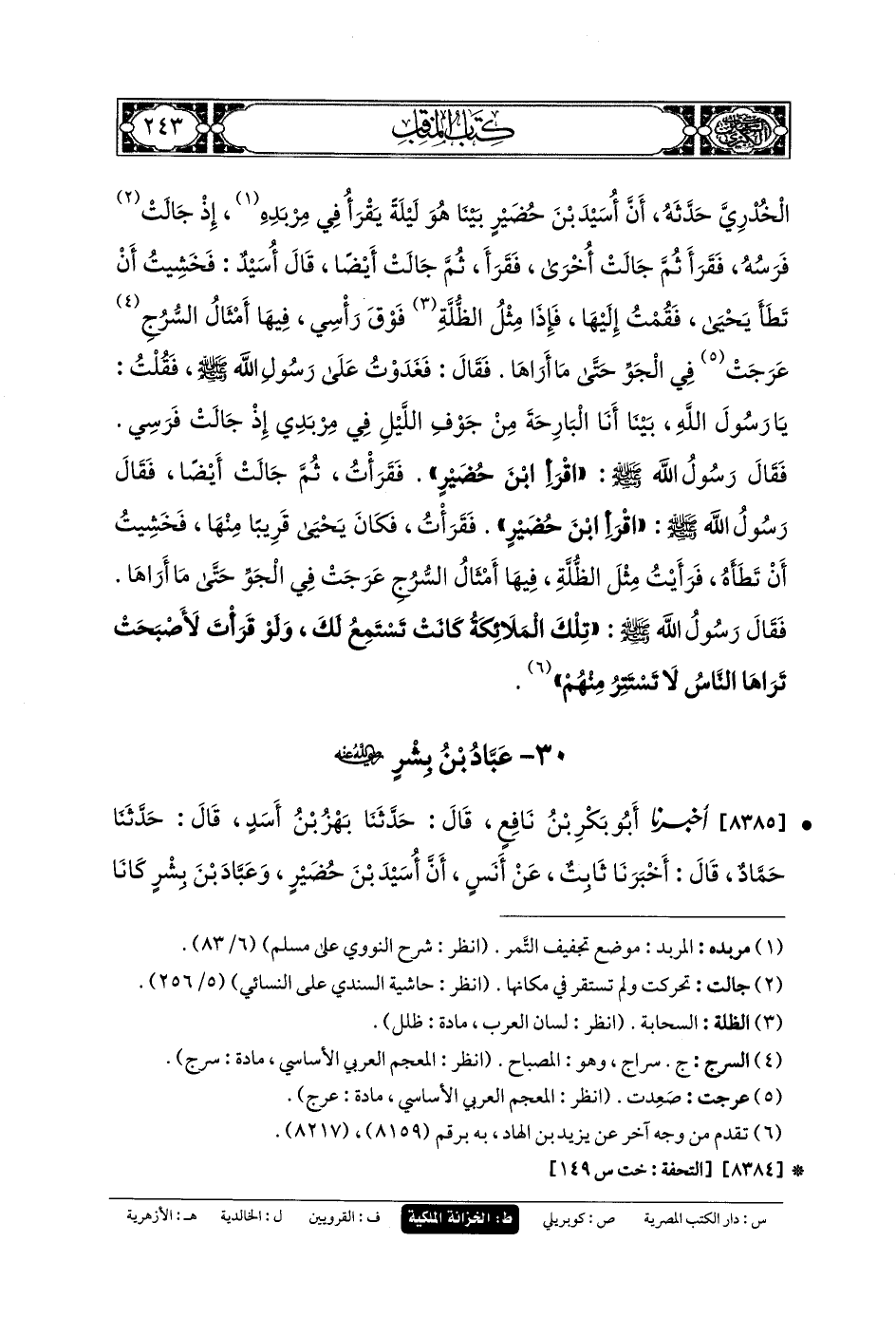 8385- أَخبَرنا أَبو بَكْرِ بنُ نَافِعٍ، قَالَ: حَدثنا بَهْزُ بنُ أَسَدِ، قَالَ: حَدثنا حَمَّادٌ، قَالَ: أَخبَرنا ثَابِتٌ، عَن أَنَسٍ، أَنَّ أُسَيْدَ بْنَ حُضَيْرٍ، وَعَبَّادَ بْنَ بِشْرٍ كَانَا عِنْدَ رَسُولِ اللهِ صَلى الله عَلَيهِ وسَلم فِي لَيْلَةٍ ظَلْمَاءَ حِنْدِسٍ، فَخَرَجَا مِنْ عِنْدِهِ، فَأَضَاءَتْ عَصَا أَحَدِهِمَا، فَجَعَلا يَمْشِيَانِ بِضَوْئِهَا، فَلَمَّا تَفَرَّقَا أَضَاءَتْ عَصَا الآخَرِ.
