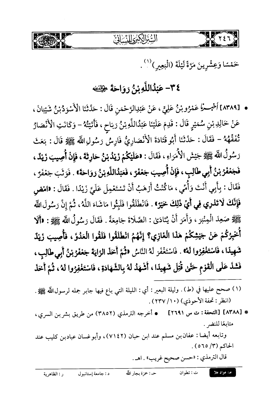 8389- أَخبَرنا عَمْرُو بنُ عَليٍّ، عَن عَبدِ الرَّحمَنِ، قَالَ: حَدثنا الأَسْوَدُ بنُ شَيْبَانَ، عَن خَالِدِ بنِ سُمَيْرٍ قَالَ: قَدِمَ عَلَيْنَا عَبدُ اللهِ بنُ رَبَاحٍ فَأَتَيْتُهُ وَكَانَتِ الأَنْصَارُ تُفَقِّهُهُ، فَقَالَ: حَدثنا أَبو قَتَادَةَ الأَنْصَارِيُّ، فَارِسُ رَسُولِ اللهِ صَلى الله عَلَيهِ وسَلم قَالَ: بَعَثَ رَسُولُ اللهِ صَلى الله عَلَيهِ وسَلم جَيْشَ الأُمَرَاءِ، فَقَالَ: عَلَيْكُمْ زَيْدُ بنُ حَارِثَةَ، فَإِنْ أُصِيبَ زَيْدٌ، فَجَعفَرُ بنُ أَبي طَالِبٍ، فَإِنْ أُصِيبَ جَعفَرُ، فَعَبدُ اللهِ بنُ رَوَاحَةَ، فَوَثَبَ جَعفَرٌ فَقَالَ: بِأَبي أَنْتَ وَأُمِّي مَا كُنْتُ أَرْهَبُ أَنْ تَسْتَعْمِلَ عَلَيَّ زَيْدًا، فَقَالَ: امْضِ، فَإِنَّكَ لا تَدْرِي فِي أَيِّ ذَلِكَ خَيْرٌ؟ فَانْطَلَقُوا، فَلَبِثُوا مَا شَاءَ اللهُ، ثُمَّ إِنَّ رَسُولَ اللهِ صَلى الله عَلَيهِ وسَلم صَعِدَ المِنْبَرَ، وَأَمَرَ أَنْ يُنَادَى الصَّلاةَ جَامِعَةً، فَقَالَ رَسُولُ اللهِ صَلى الله عَلَيهِ وسَلم: أَلا أُخْبِرُكُمْ عَن جَيْشِكُمْ هَذَا الغَازِي؟ إِنَّهُمُ انْطَلَقُوا، فَلَقُوا العَدُوَّ، فَأُصِيبَ زَيْدٌ شَهِيدًا، فَاسْتَغْفِرُوا لَهُ، فَاسْتَغْفَرَ لَهُ النَّاسُ، ثُمَّ أَخَذَ الرَّايَةَ جَعفَرُ بنُ أَبي طَالِبٍ، فَشَدَّ عَلَى القَوْمِ حَتَّى قُتِلَ شَهِيدًا، أَشْهَدُ لَهُ بِالشَّهَادَةِ، فَاسْتَغْفِرُوا لَهُ، ثُمَّ أَخَذَ اللِّوَاءَ عَبدُ اللهِ بنُ رَوَاحَةَ، فَأَثْبَتَ قَدَمَيْهِ حَتَّى قُتِلَ شَهِيدًا، فَاسْتَغْفِرُوا لَهُ، ثُمَّ أَخَذَ اللِّوَاءَ خَالِدُ بنُ الوَلِيدِ، وَلَمْ يَكُنْ مِنَ الأُمَرَاءِ، هُوَ أَمَّرَ نَفْسَهُ، ثُمَّ رَفَعَ رَسُولُ اللهِ صَلى الله عَلَيهِ وسَلم إِصْبُعَيْهِ، ثُمَّ قَالَ: اللهُمَّ إِنَّهُ سَيْفٌ مِنْ سُيُوفِكَ، فَانْتَصِرْ بِهِ، ثُمَّ قَالَ: انْفِرُوا فَأَمِدُّوا (1) إِخْوَانَكُمْ، وَلا يَخْتَلِفَنَّ أَحَدٌ، فَنَفَرَ النَّاسُ فِي حَرٍّ شَدِيدٍ مُشَاةً وَرُكْبَانًا.
