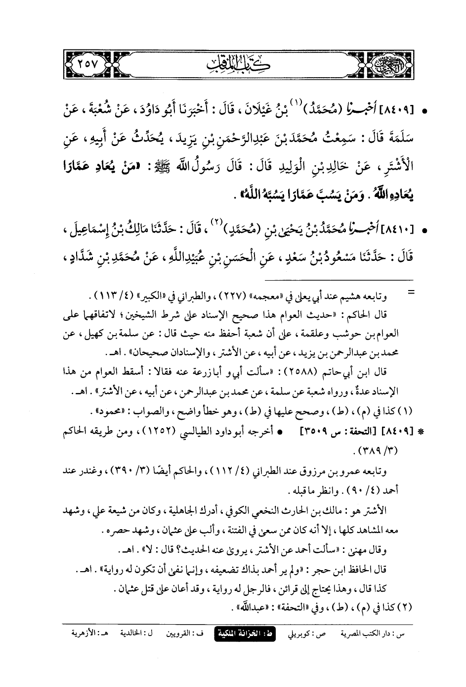 8409- أَخبَرنا مَحْمُودُ بنُ غَيْلانَ، قَالَ: أَخبَرنا أَبو دَاوُدَ، عَن شُعبَةَ، عَن سَلَمَةَ، قَالَ: سَمِعْتُ مُحَمدَ بْنَ عَبدِ الرَّحمَنِ بْنَ يَزِيدَ يُحَدِّثُ عَن أَبيهِ، عَنِ الأَشْتَرِ، عَن خَالِدِ بنِ الوَلِيدِ قَالَ: قَالَ رَسُولُ اللهِ صَلى الله عَلَيهِ وسَلم: مَنْ يُعَادِ عَمَّارًا يُعَادِهِ اللهُ، وَمَنْ يَسُبُّ عَمَّارًا يَسُبُّهُ اللهُ.