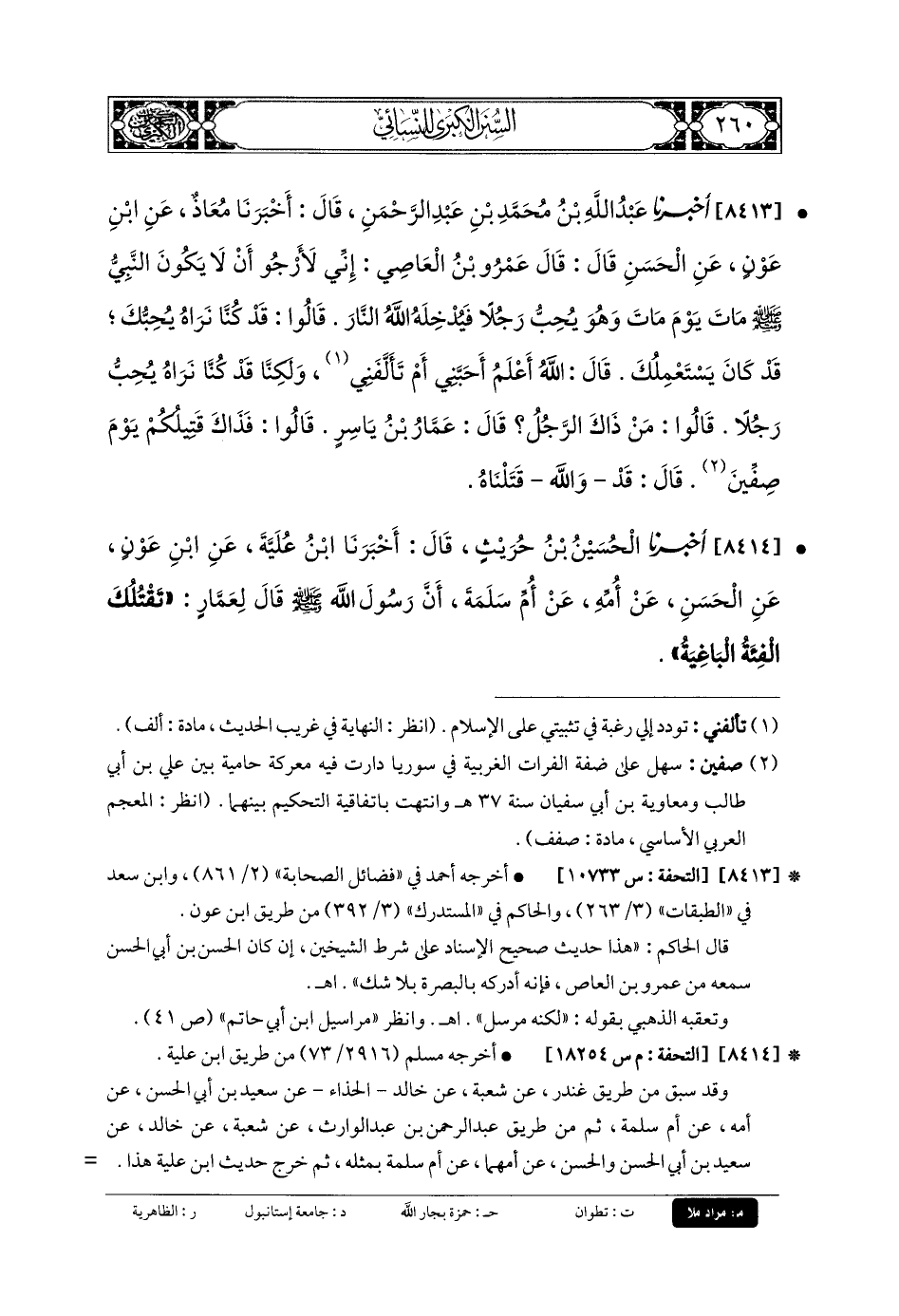8413- أَخبَرنا عَبدُ اللهِ بنُ مُحَمدِ بنِ عَبدِ الرَّحمَنِ، قَالَ: أَخبَرنا مُعَاذٌ، عَنِ ابنِ عَوْنٍ، عَنِ الحَسَنِ قَالَ: قَالَ عَمْرُو بنُ العَاصي: إِنِّي لأَرْجُو أَنْ لا يَكُونَ النَّبيُّ صَلى الله عَلَيهِ وسَلم مَاتَ يَوْمَ مَاتَ وَهُوَ يُحِبُّ رَجُلاً فَيُدْخِلُهُ اللهُ النَّارَ، قَالُوا: قَدْ كُنَّا نَرَاهُ يُحِبُّكَ، قَدْ كَانَ يَسْتَعْمِلُكَ، قَالَ: اللهُ أَعْلَمُ، أَحَبَّنِي أَمْ تَأَلَّفَنِي، وَلَكِنَّا قَدْ كُنَّا نَرَاهُ يُحِبُّ رَجُلاً، قَالُوا: مَنْ ذَاكَ الرَّجُلُ؟ قَالَ: عَمَّارُ بنُ يَاسِرٍ، قَالُوا: فَذَاكَ قَتِيلُكُمْ يَوْمَ صِفِّينِ قَالَ: قَدْ وَاللهِ قَتَلْنَاهُ.