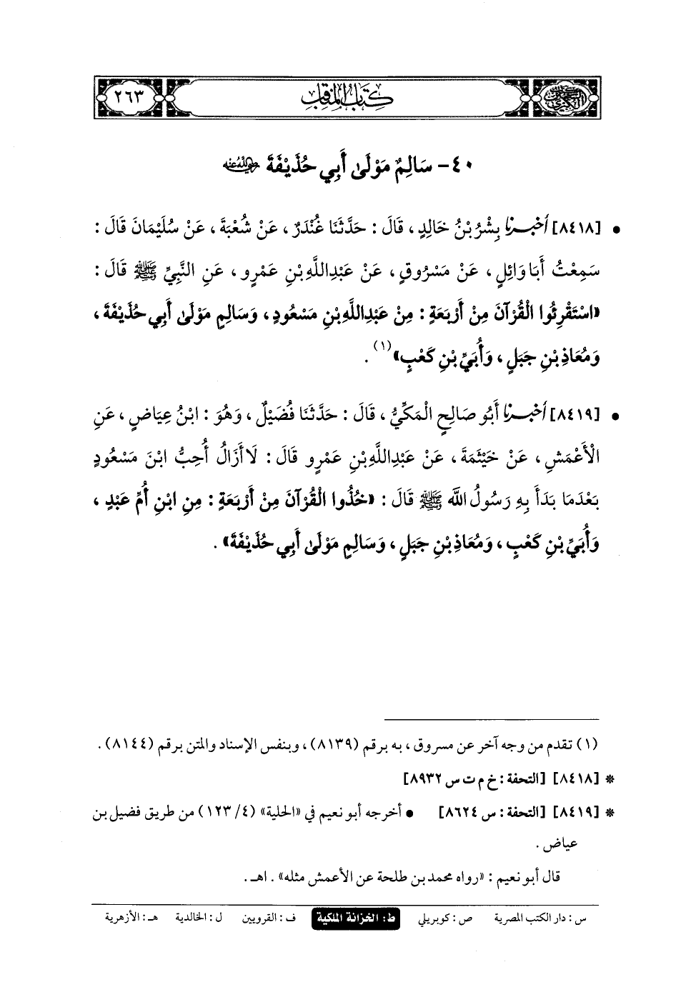 8418- أَخبَرنا بِشْرُ بنُ خَالِدٍ، قَالَ: حَدثنا غُنْدَرٌ، عَن شُعبَةَ، عَن سُلَيمَانَ، قَالَ: سَمِعْتُ أَبَا وَائِلٍ، عَن مَسْرُوقٍ، عَن عَبدِ اللهِ بنِ عَمْرٍو، عَنِ النَّبيِّ صَلى الله عَلَيهِ وسَلم قَالَ: اسْتَقْرِئُوا القُرْآنَ مِنْ أَرْبَعَةٍ: مِنْ عَبدِ اللهِ بنِ مَسْعُودٍ، وَسَالِمٍ مَوْلَى أَبي حُذَيْفَةَ، وَمُعَاذِ بنِ جَبَلٍ، وَأُبَيِّ بنِ كَعْبٍ.
