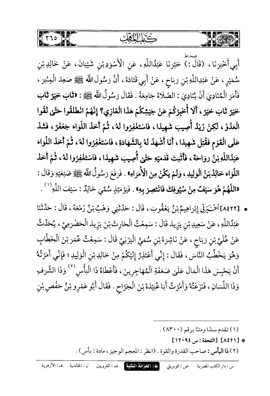 8422- أَخْبَرَنِي إِبْرَاهِيمُ بنُ يَعْقُوبَ، قَالَ: حَدَّثني وَهْبُ بنُ زَمْعَةَ، قَالَ: حَدثنا عَبدُ اللهِ، عَن سَعِيدِ بنِ يَزِيدَ، قَالَ: سَمِعْتُ الحَارِثَ بْنَ يَزِيدَ الحَضْرَمِيَّ يُحَدِّثُ عَن عُليِّ بنِ رَبَاحٍ، عَن نَاشِرَةَ بنِ سُمَيٍّ اليَزَنِيِّ، قَالَ: سَمِعْتُ عُمَرَ بْنَ الخَطَّابِ وَهُوَ يَخْطُبُ النَّاسَ فَقَالَ: إِنِّي أَعْتَذِرُ إِلَيْكُمْ مِنْ خَالِدِ بنِ الوَلِيدِ، فَإِنِّي أَمَّرْتُهُ أَنْ يَحْبِسَ هَذَا المَالَ عَلَى ضَعَفَةِ المُهَاجِرِينَ، فَأَعْطَاهُ ذَا البَأْسَ، وَذَا الشَّرَفِ، وَذَا اللِّسَانَ، فَنَزَعْتُهُ، وَأَمَّرْتُ أَبَا عُبَيدَةَ بْنَ الجَرَّاحِ، فَقَالَ أَبو عَمْرِو بنِ حَفْصِ بنِ المُغِيرَةِ: لَقَدْ نَزَعْتَ عَامِلاً اسْتَعْمَلَهُ رَسُولُ اللهِ صَلى الله عَلَيهِ وسَلم، وَأَغْمَدْتَ سَيْفًا سَلَّهُ رَسُولُ اللهِ صَلى الله عَلَيهِ وسَلم، وَوَضَعْتَ لِوَاءً نَصَبَهُ رَسُولُ اللهِ صَلى الله عَلَيهِ وسَلم، وَلَقَدْ قَطَعْتَ الرَّحِمَ، وَحَسَدْتَ ابنَ العَمِّ، فَقَالَ عُمَرُ: إِنَّكَ قَرِيبُ القَرَابَةِ، حَدِيثُ السِّنِّ، مُغْضَبٌ فِي ابنِ عَمِّكَ.