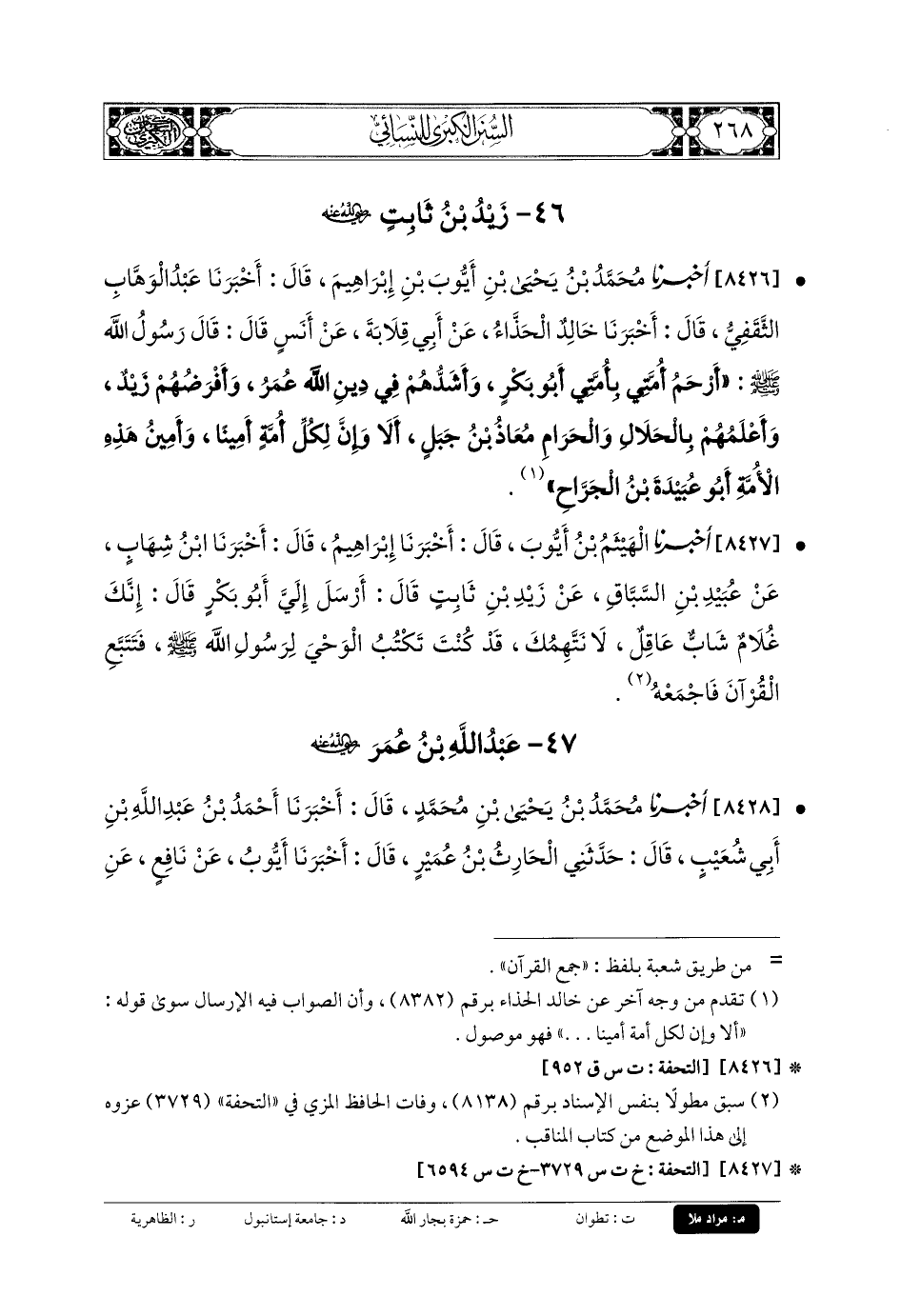8426- أَخبَرنا مُحَمدُ بنُ يَحيَى بنِ أَيوبَ بنِ إِبْرَاهِيمَ، قَالَ: أَخبَرنا عَبدُ الوَهَّابِ الثَّقَفِيُّ، قَالَ: أَخبَرنا خَالِدٌ الحَذَّاءُ، عَن أَبي قِلابَةَ، عَن أَنَسٍ قَالَ: قَالَ رَسُولُ اللهِ صَلى الله عَلَيهِ وسَلم: أَرْحَمُ أُمَّتِي بِأُمَّتِي أَبو بَكْرٍ، وَأَشَدُّهُمْ فِي دِينِ اللهِ عُمَرُ، وَأَفْرَضُهُمْ زَيْدٌ، وَأَعْلَمُهُمْ بِالحَلالِ وَالحَرَامِ مُعَاذُ بنُ جَبَلٍ، أَلا وَإِنَّ لِكُلِّ أَمَةٍ أَمِينًا، وَأَمِينُ هَذِهِ الأُمَّةِ أَبو عُبَيدَةَ بنُ الجَرَّاحِ.