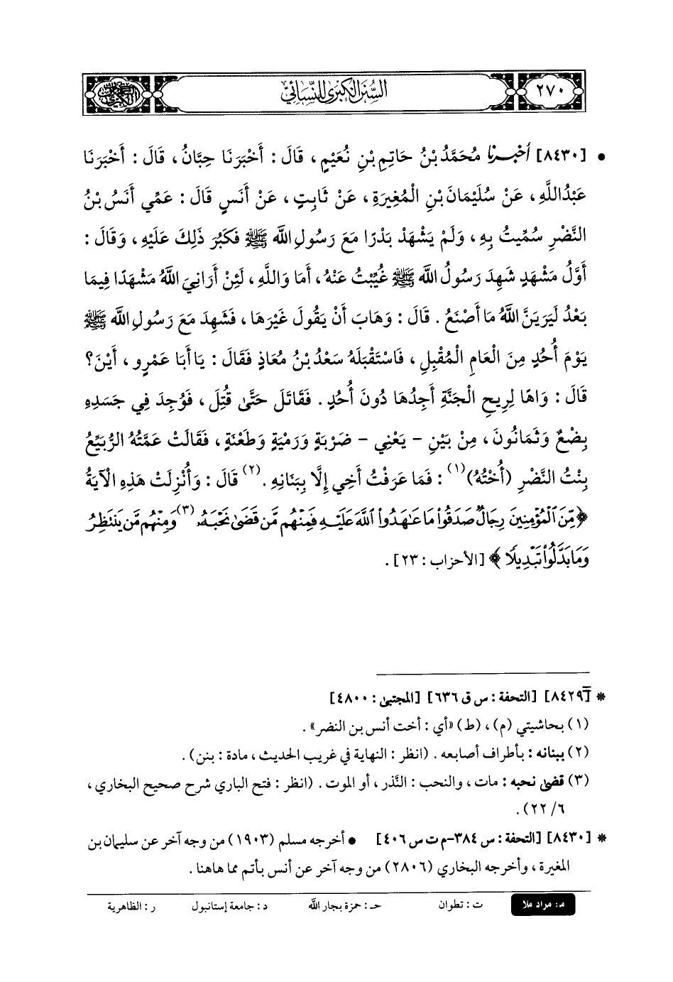 8430- أَخبَرنا مُحَمدُ بنُ حَاتِمِ بنِ نُعَيْمٍ، قَالَ: أَخبَرنا حِبَّانُ، قَالَ: أَخبَرنا عَبدُ اللهِ، عَن سُلَيمَانَ بنِ المُغِيرَةِ، عَن ثَابِتٍ، عَن أَنَسٍ قَالَ: عَمِّي أَنَسُ بنُ النَّضْرِ، سُمِّيتَ بِهِ، وَلَمْ يَشْهَدْ بَدْرًا مَعَ رَسُولِ اللهِ صَلى الله عَلَيهِ وسَلم، فَكَبُرَ ذَلِكَ عَلَيْهِ، وَقَالَ: أَوَّلُ مَشْهَدٍ شَهِدَ رَسُولُ اللهِ صَلى الله عَلَيهِ وسَلم غُيِّبْتُ عَنهُ، أَمَا وَاللهِ لَئِنْ أَرَانِي اللهُ مَشْهَدًا فِيمَا بَعْدُ لَيَرَيَنَّ اللهُ مَا أَصْنَعُ، قَالَ: وَهَابَ أَنْ يَقُولَ غَيْرَهَا، فَشَهِدَ مَعَ رَسُولِ اللهِ صَلى الله عَلَيهِ وسَلم يَوْمَ أُحُدٍ مِنَ العَامِ المُقْبِلِ، فَاسْتَقْبَلَهُ سَعْدُ بنُ مُعَاذٍ فَقَالَ: يَا أَبَا عَمْرٍو أَيْنَ؟ قَالَ: وَاهًا لِرِيحِ الجَنَّةِ، أَجِدُهَا دُونَ أُحُدٍ، فَقَاتَلَ حَتَّى قُتِلَ، فَوُجِدَ فِي جَسَدِهِ بِضْعٌ وَثَمَانُونَ مِنْ بَيْنِ، يَعْنِي ضَرْبَةٍ، وَرَمْيَةٍ، وَطَعْنَةٍ، فَقَالَتْ عَمَّتِي (1) الرُّبَيِّعُ بِنْتُ النَّضْرِ أُخْتُهُ: فَمَا عَرَفْتُ أَخِي إِلاَّ بِبَنَانِهِ، قَالَ: وَأُنْزِلَتْ هَذِهِ الآيَةُ: {مِنَ المُؤْمِنِينَ رِجَالٌ صَدَقُوا مَا عَاهَدُوا اللهَ عَلَيْهِ فَمِنْهُمْ مَنْ قَضَى نَحْبَهُ وَمِنْهُمْ مَنْ يَنْتَظِرُ وَمَا بَدَّلُوا تَبْدِيلاً}.