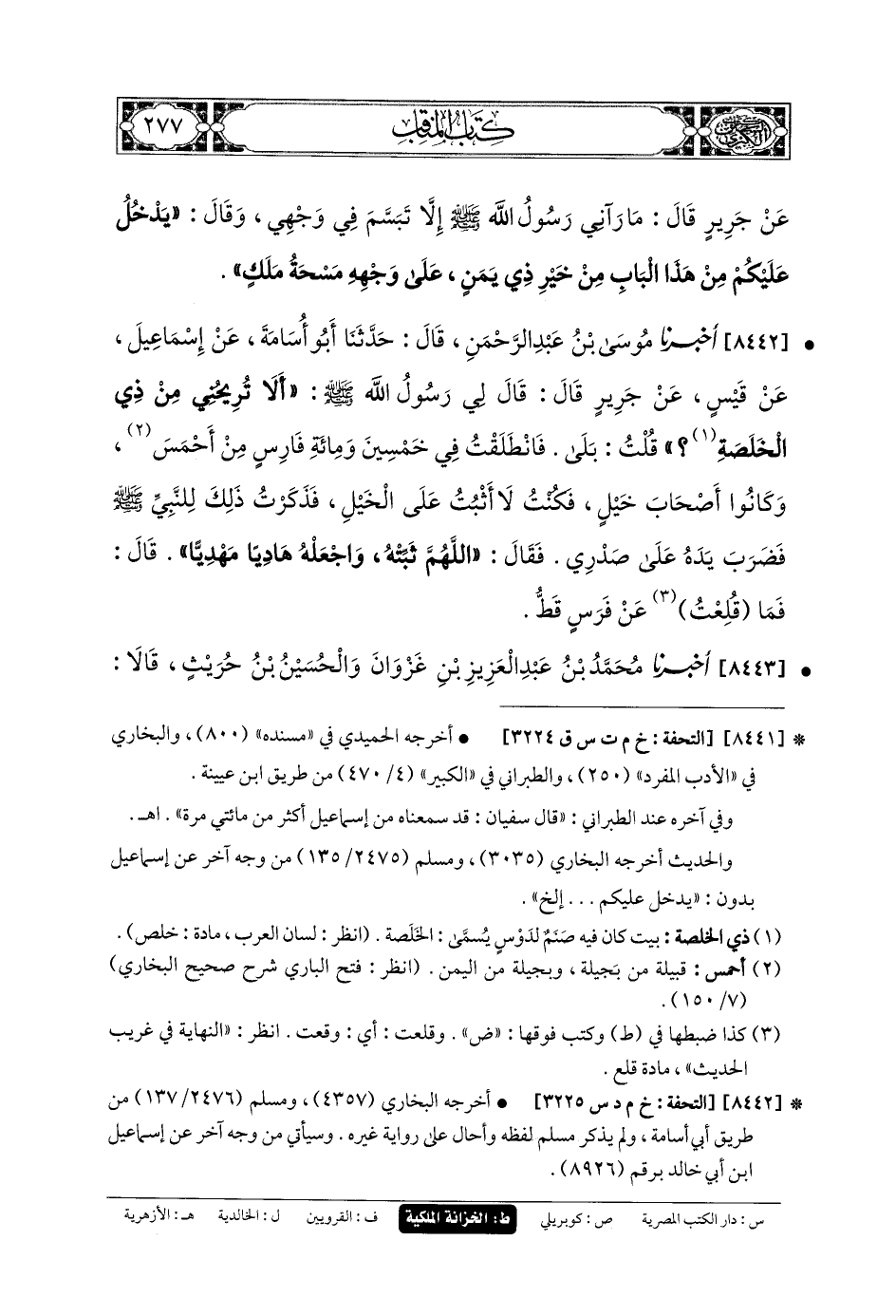 8442- أَخبَرنا مُوسَى بنُ عَبدِ الرَّحمَنِ، قَالَ: حَدثنا أَبو أُسَامَةَ، عَن إِسمَاعِيلَ، عَن قَيْسٍ، عَن جَرِيرٍ قَالَ: قَالَ لِي رَسُولُ اللهِ صَلى الله عَلَيهِ وسَلم: أَلا تُرِيحُنِي مِنْ ذِي الخَلَصَةِ؟ قُلْتُ: بَلَى، فَانْطَلَقْتُ فِي خَمْسِينَ وَمِئَةِ فَارِسٍ مِنْ أَحْمَسَ، وَكَانُوا أَصْحَابَ خَيْلٍ، فَكُنْتُ لا أَثْبُتُ عَلَى الخَيْلِ، فَذَكَرْتُ ذَلِكَ لِلنَّبِيِّ صَلى الله عَلَيهِ وسَلم فَضَرَبَ يَدَهُ عَلَى صَدْرِي، فَقَالَ: اللهُمَّ ثَبِّتْهُ، وَاجْعَلْهُ هَادِيًا مَهْدِيًّا، قَالَ: فَمَا قُلِعْتُ عَن فَرَسٍ قَطُّ.