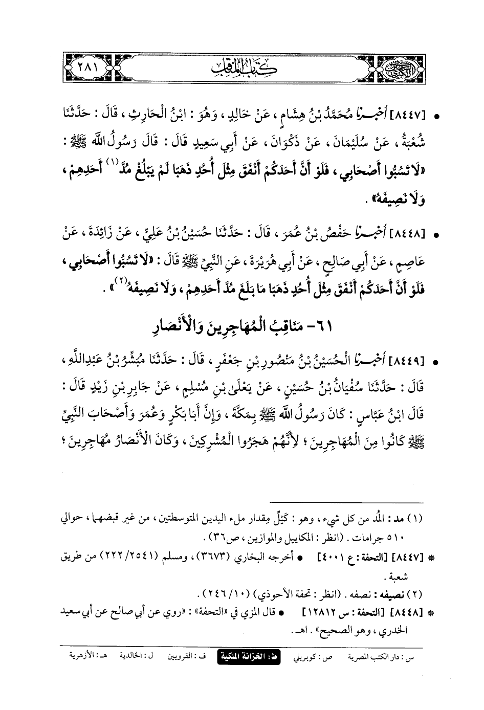 8448- أَخبَرنا حَفْصُ بنُ عُمَرَ، قَالَ: حَدثنا حُسَيْنُ بنُ عَليٍّ، عَن زَائِدَةَ، عَن عَاصِمٍ، عَن أَبي صَالِحٍ، عَن أَبي هُرَيْرَةَ، عَنِ النَّبيِّ صَلى الله عَلَيهِ وسَلم قَالَ: لا تَسُبُّوا أَصْحَابِي، فَلَوْ أَنَّ أَحَدَكُمْ أَنْفَقَ مِثْلَ أُحُدٍ ذَهَبًا، مَا بَلَغَ مُدَّ أَحَدِهِمْ وَلا نَصِيفَهُ.