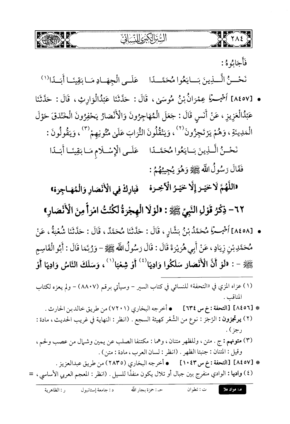 8457- أَخبَرنا عِمْرَانُ بنُ مُوسَى، قَالَ: حَدثنا عَبدُ الوَارِثِ، قَالَ: حَدثنا عَبدُ العَزِيزِ، عَن أَنَسٍ قَالَ: جَعَلَ المُهَاجِرُونَ وَالأَنْصَارُ يَحْفِرُونَ الخَنْدَقَ حَوْلَ المَدِينَةِ وَهُمْ يَرْتَجِزُونَ وَيَنْقُلُونَ التُّرَابَ عَلَى مُتُونِهِمْ وَيَقُولُونَ: