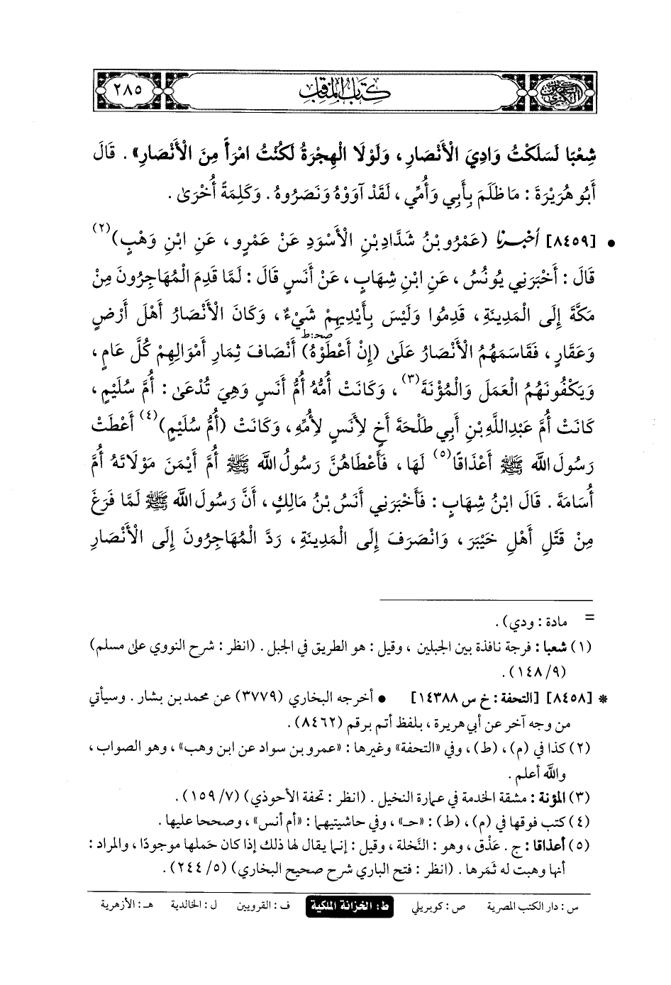 8459- أَخبَرنا عَمْرُو بنُ سَوَّادِ بنِ الأَسْوَدِ بنِ عَمْرٍو (1)، عَنِ ابنِ وَهْبٍ، قَالَ: أَخْبَرَنِي يُونُسُ، عَنِ ابنِ شِهَابٍ، عَن أَنَسٍ قَالَ: لَمَّا قَدِمَ المُهَاجِرُونَ مِنْ مَكَّةَ إِلَى المَدِينَةِ، قَدِمُوا وَلَيْسَ بِأَيْدِيهِمْ شَيْءٌ، وَكَانَ الأَنْصَارُ أَهْلَ أَرْضٍ وَعَقَارٍ، فَقَاسَمَهُمُ الأَنْصَارُ عَلَى إنْ أَعْطُوهُمْ (2) أَنْصَافَ ثِمَارِ أَمْوَالِهِمْ كُلَّ عَامٍ، وَيَكْفُونَهُمُ العَمَلَ والمُؤْنَةَ، وَكَانَتْ أُمُّهُ أُمُّ أَنَسٍ، وَهِيَ تُدْعَى أُمَّ سُلَيْمٍ، كَانَتْ أُمَّ عَبدِ اللهِ بنِ أَبي طَلحَةَ أَخٍ لأَنَسٍ لأُمِّهِ، وَكَانَتْ أُمُّ أَنَسٍ أَعْطَتْ رَسُولَ اللهِ صَلى الله عَلَيهِ وسَلم أَعْذَاقًا لَهَا، فَأَعْطَاهُنَّ رَسُولُ اللهِ صَلى الله عَلَيهِ وسَلم أُمَّ أَيْمَنَ مَوْلاتَهُ أُمَّ أُسَامَةَ.