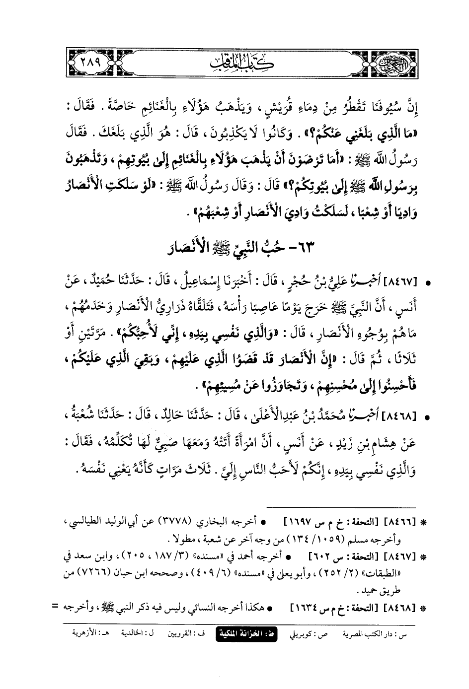 8467- أَخبَرنا عَليُّ بنُ حُجْرٍ، قَالَ: أَخبَرنا إِسمَاعِيلُ، قَالَ: حَدثنا حُمَيْدٌ، عَن أَنَسٍ، أَنَّ النَّبيَّ صَلى الله عَلَيهِ وسَلم خَرَجَ يَوْمًا عَاصِبًا رَأْسَهُ، فَتَلَقَّاهُ ذَرَارِيُّ الأَنْصَارِ وَخَدَمُهُمْ مَا هُمْ بِوُجُوهِ الأَنْصَارِ، قَالَ: وَالَّذِي نَفْسِي بِيَدِهِ، إِنِّي لأُحِبُّكُمْ مَرَّتَيْنِ، أَوْ ثَلاثًا، ثُمَّ قَالَ: إِنَّ الأَنْصَارَ قَدْ قَضَوَا الَّذِي عَلَيْهِمْ، وَبَقِيَ الَّذِي عَلَيْكُمْ، فَأَحْسِنُوا إِلَى مُحْسِنِهِمْ، وَتَجَاوَزُوا عَن مُسِيئِهِمْ.