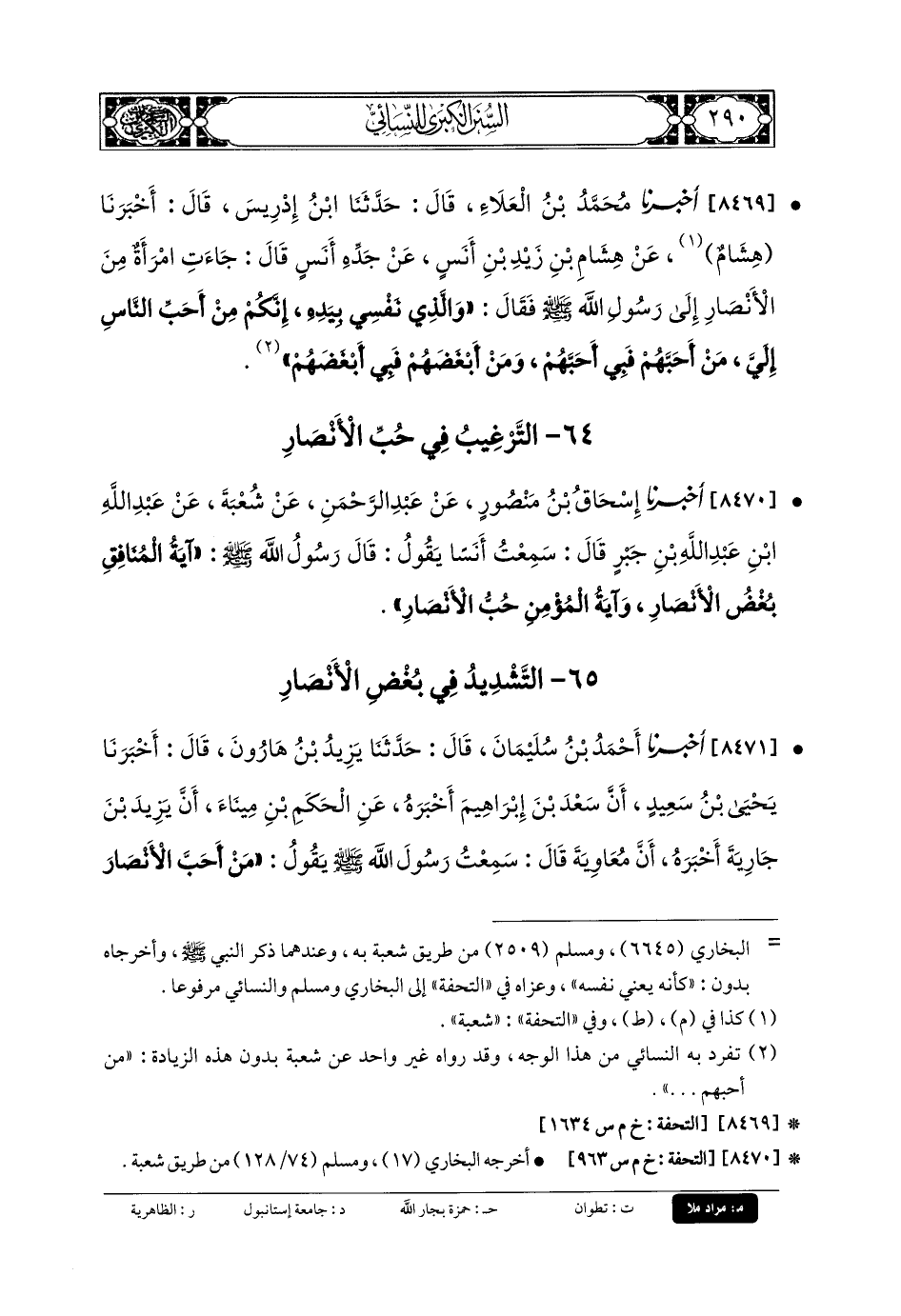8470- أَخبَرنا إِسحَاقُ بنُ مَنصُورٍ، عَن عَبدِ الرَّحمَنِ، عَن شُعبَةَ، عَن عَبدِ اللهِ بنِ عَبدِ اللهِ بنِ جَبْرٍ، قَالَ: سَمِعْتُ أَنَسًا يَقُولُ: قَالَ رَسُولُ اللهِ صَلى الله عَلَيهِ وسَلم: آيَةُ المُنَافِقِ بُغْضُ الأَنْصَارِ، وَآيَةُ المُؤْمِنِ حُبُّ الأَنْصَارِ.
