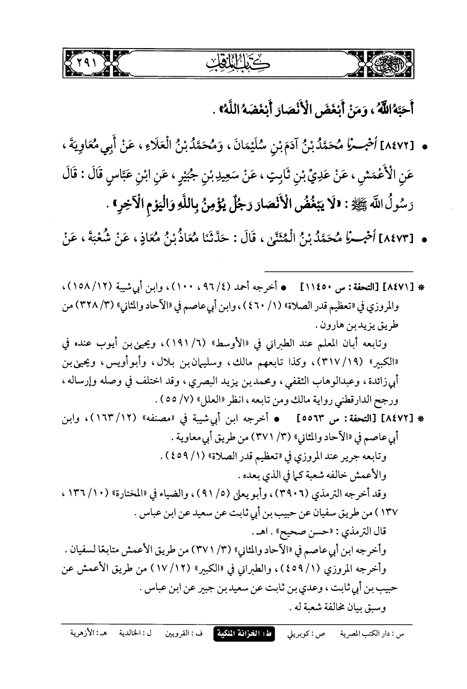 8472- أَخبَرنا مُحَمدُ بنُ آدَمَ بنِ سُلَيمَانَ، وَمُحَمدُ بنُ العَلاءِ، عَن أَبي مُعاويَةَ، عَنِ الأَعْمَشِ، عَن عَدِيِّ بنِ ثَابِتٍ، عَن سَعِيدِ بنِ جُبَيْرٍ، عَنِ ابنِ عَبَّاسٍ قَالَ: قَالَ رَسُولُ اللهِ صَلى الله عَلَيهِ وسَلم: لا يَبْغُضُ الأَنْصَارَ رَجُلٌ يُؤْمِنْ بِاللهِ وَاليَوْمِ الآخِرِ.