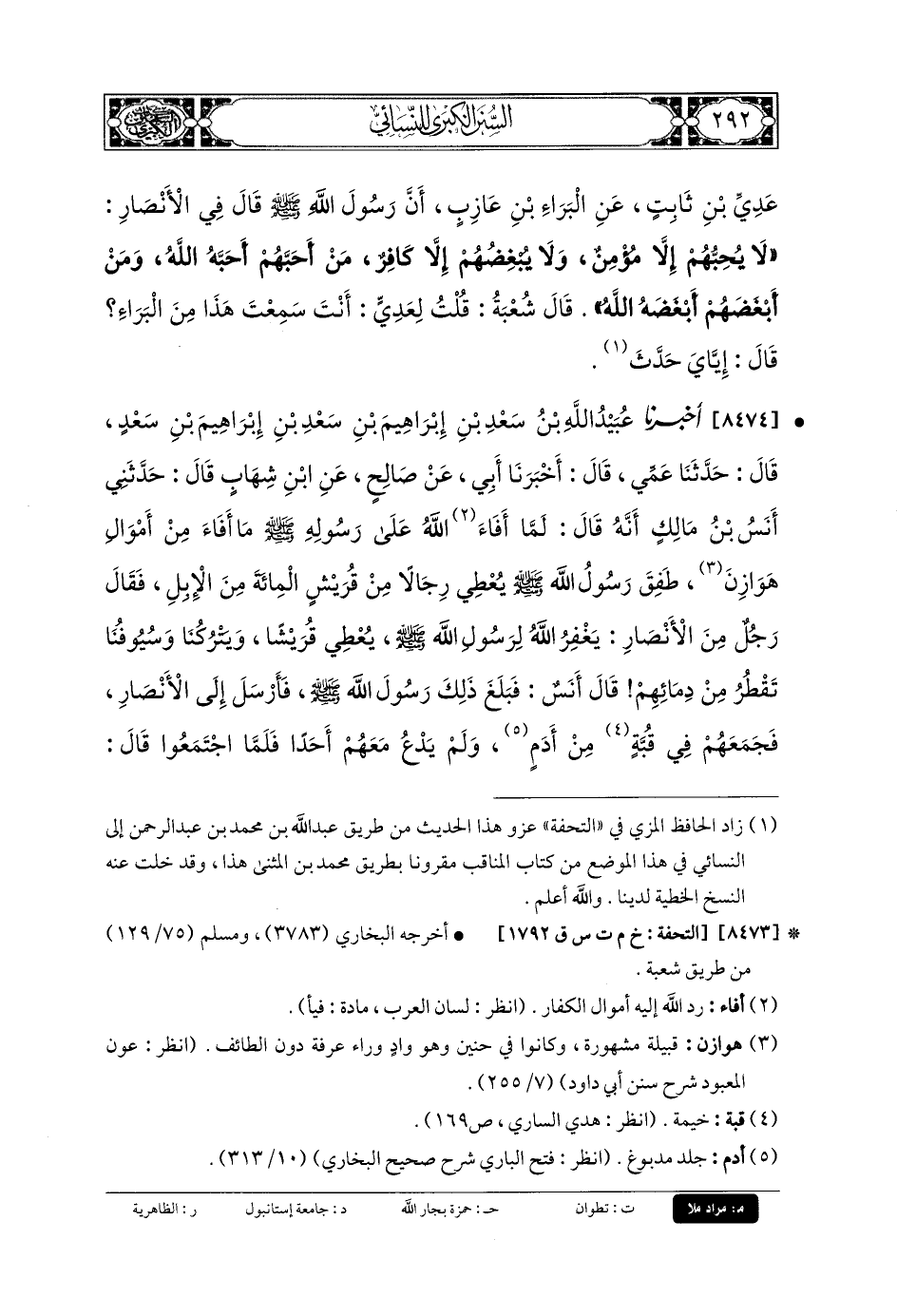 8474- أَخبَرنا عُبَيدُ اللهِ بنُ سَعْدِ بنِ إِبْرَاهِيمَ بنِ سَعْدِ بنِ إِبْرَاهِيمَ بنِ سَعْدٍ، قَالَ: حَدثنا عَمِّي، قَالَ: أَخبَرنا أَبي، عَن صَالِحٍ، عَنِ ابنِ شِهَابٍ، قَالَ: حَدَّثني أَنَسُ بنُ مَالِكٍ أَنَّهُ قَالَ: لَمَّا أَفَاءَ اللهُ عَلَى رَسُولِهِ مَا أَفَاءَ مِنْ أَمْوَالِ هَوَازِنَ، طَفِقَ رَسُولُ اللهِ صَلى الله عَلَيهِ وسَلم يُعْطِي رِجَالاً مِنْ قُرَيْشٍ المِئَةَ مِنَ الإِبِلِ، فَقَالَ رَجُلٌ مِنَ الأَنْصَارِ: يَغْفِرُ اللهُ لِرَسُولِ اللهِ صَلى الله عَلَيهِ وسَلم يُعْطِي قُرَيْشًا وَيَتْرُكُنَا، وَسُيُوفُنَا تَقْطُرُ مِنْ دِمَائِهِمْ، قَالَ أَنَسٌ: فَبَلَغَ ذَلِكَ رَسُولَ اللهِ صَلى الله عَلَيهِ وسَلم، فَأَرْسَلَ إِلَى الأَنْصَارِ، فَجَمَعَهُمْ فِي قُبَّةٍ مِنْ أَدَمٍ، وَلَمْ يَدْعُ مَعَهُمْ أَحَدًا، فَلَمَّا اجْتَمَعُوا قَالَ: مَا حَدِيثٌ بَلَغَنِي عَنكُمْ؟ قَالَ فُقَهَاءُ الأَنْصَارِ: أَمَّا ذَوُو الرَّأْيِ مِنَّا فَلَمْ يَقُولُوا شَيْئًا، وَإِنَّمَا أُنَاسٌ حَدِيثَةٌ أَسْنَانُهُمْ، فَقَالُوا: يَغْفِرُ اللهُ لِرَسُولِ اللهِ صَلى الله عَلَيهِ وسَلم يُعْطِي قُرَيْشًا، وَيَتْرُكُنَا، وَسُيُوفُنَا تَقْطُرُ مِنْ دِمَائِهِمْ، فَقَالَ رَسُولُ اللهِ صَلى الله عَلَيهِ وسَلم: إِنِّي لأُعْطِي رِجَالاً حَدِيثٌ عَهْدُهُمْ بِالكُفْرِ فَأَتَأَلَّفُهُمْ، أَفَلا تَرْضَوْنَ أَنْ يَذْهَبَ النَّاسُ بِالأَمْوَالِ، وَتَرْجِعُونَ إِلَى رِحَالِكُمْ بِرَسُولِ اللهِ صَلى الله عَلَيهِ وسَلم؟ فَوَاللَّهِ لَمَا تَنْقَلِبُونَ مِنْهُ خَيْرٌ مِمَّا يَنْقَلِبُونَ بِهِ، قَالُوا: بَلَى، يَا رَسُولَ اللهِ، قَدْ رَضِينَا، فَقَالَ لَهُمْ: إِنَّكُمْ سَتَلْقَوْنَ بَعْدِي أَثَرَةً شَدِيدَةً، فَاصْبِرُوا حَتَّى تَلْقَوُا اللهَ وَرَسُولَهُ عَلَى الحَوْضِ، قَالَ أَنَسٌ: فَلَمْ نَصْبِرْ.